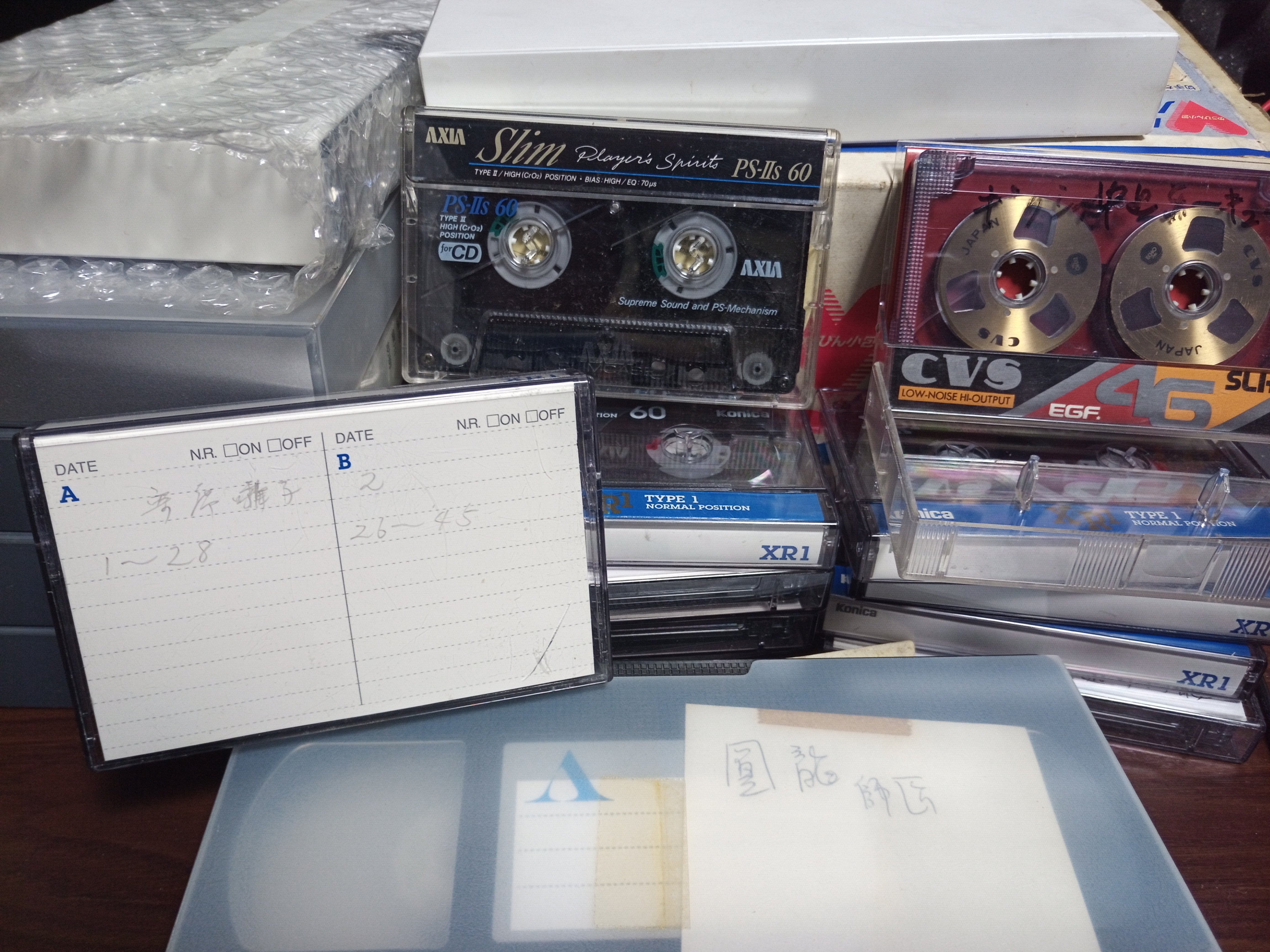 独演会で記録用に残しておいたのであろう録音テープを一部譲って頂きました。演題も何も記載されていない録音テープなどが多く、圓龍師匠の声が入っているのかどうか分からない状態です。テープもかなり古そうな物もありましたが、しっかり保存されてこなかった為に汚れがひどいだけかもしれません。もしかしたら圓生師の音声が残っているのではないかと仰る方もいますが、正直わからない状態です。圓生師に稽古をつけてもらっている時の音声など出てきたらいいのですが、それは調べてみるほかありません。放置しておけば劣化するだけですので、出来るだけ早くデジタル化するつもりです。