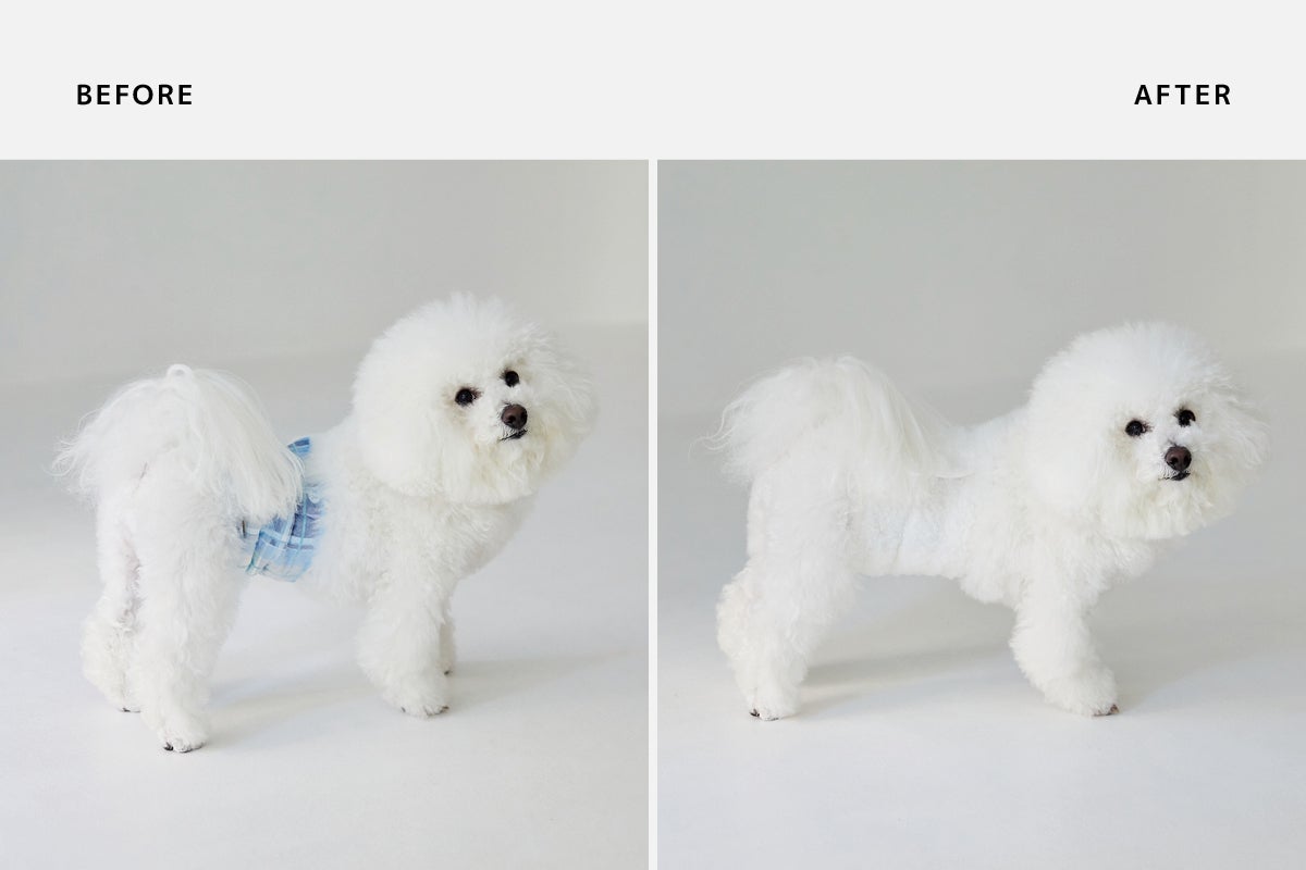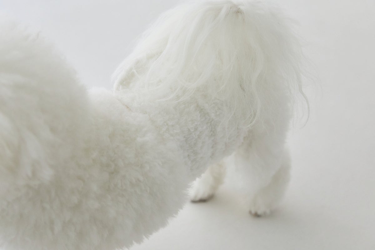 そこで、友人の衣装デザイナー・西郡 唯さんにお願いをして、ビションの毛並みに馴染む白色のボア素材で、タグもつけないシンプルなマナーベルトを作ってもらいました。
