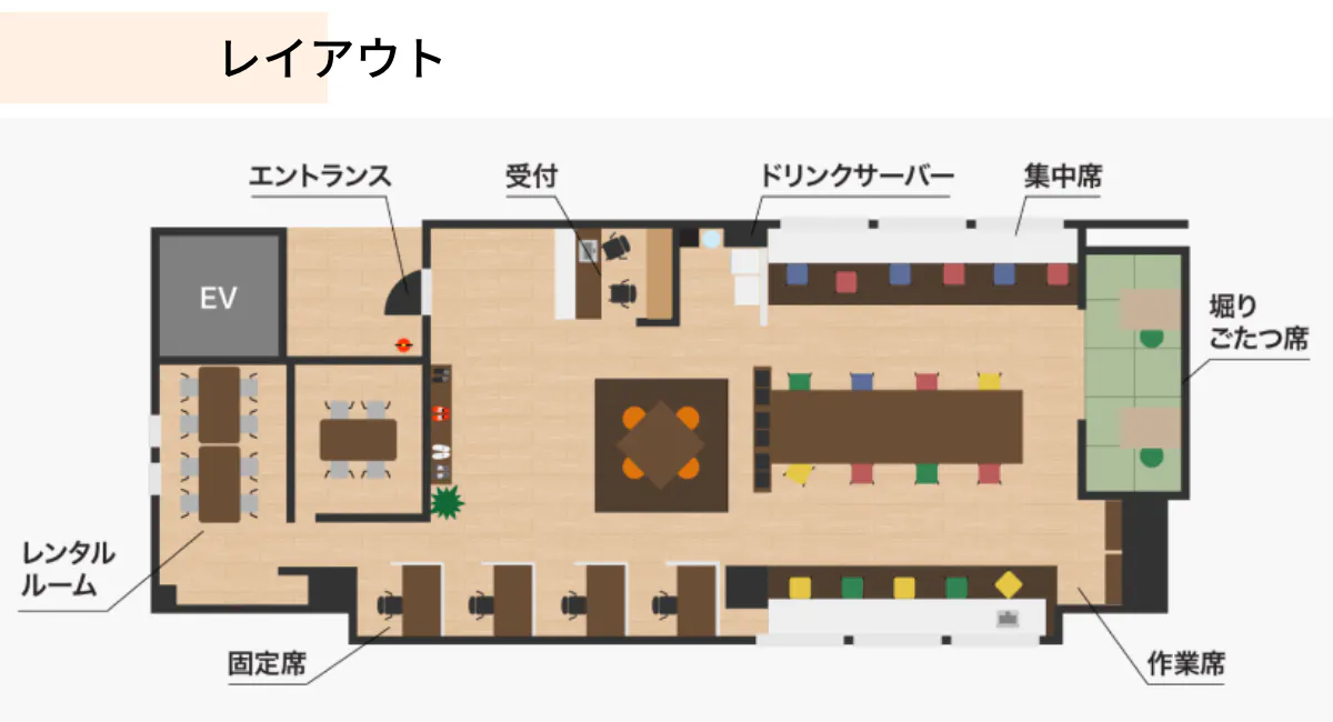 ・固定ブース席 4席 ・集中ブース席 6席 ・通常作業席 25席 ・会議室2室