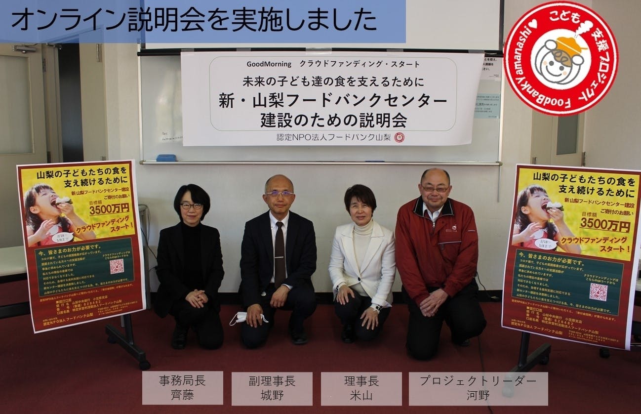 本日「新・山梨フードバンクセンター」建設のためのオンライン説明会を実施しました。30名を超える、企業・団体の皆様にご参加いただき感謝申し上げます。また、TV・新聞社5社にもお越しいただきました。本日18:15から「YBSワイドニュース」 で放映されます。山梨県にお住まいの方はよろしければご覧ください。