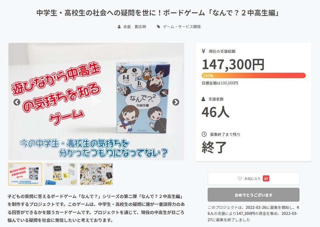 昨夜、なんで?シリーズの第二弾「なんで?2中高生編」のクラウドファンディングが無事終了し、46名の方に支援いただき、目標金額の147%を集めることができました!