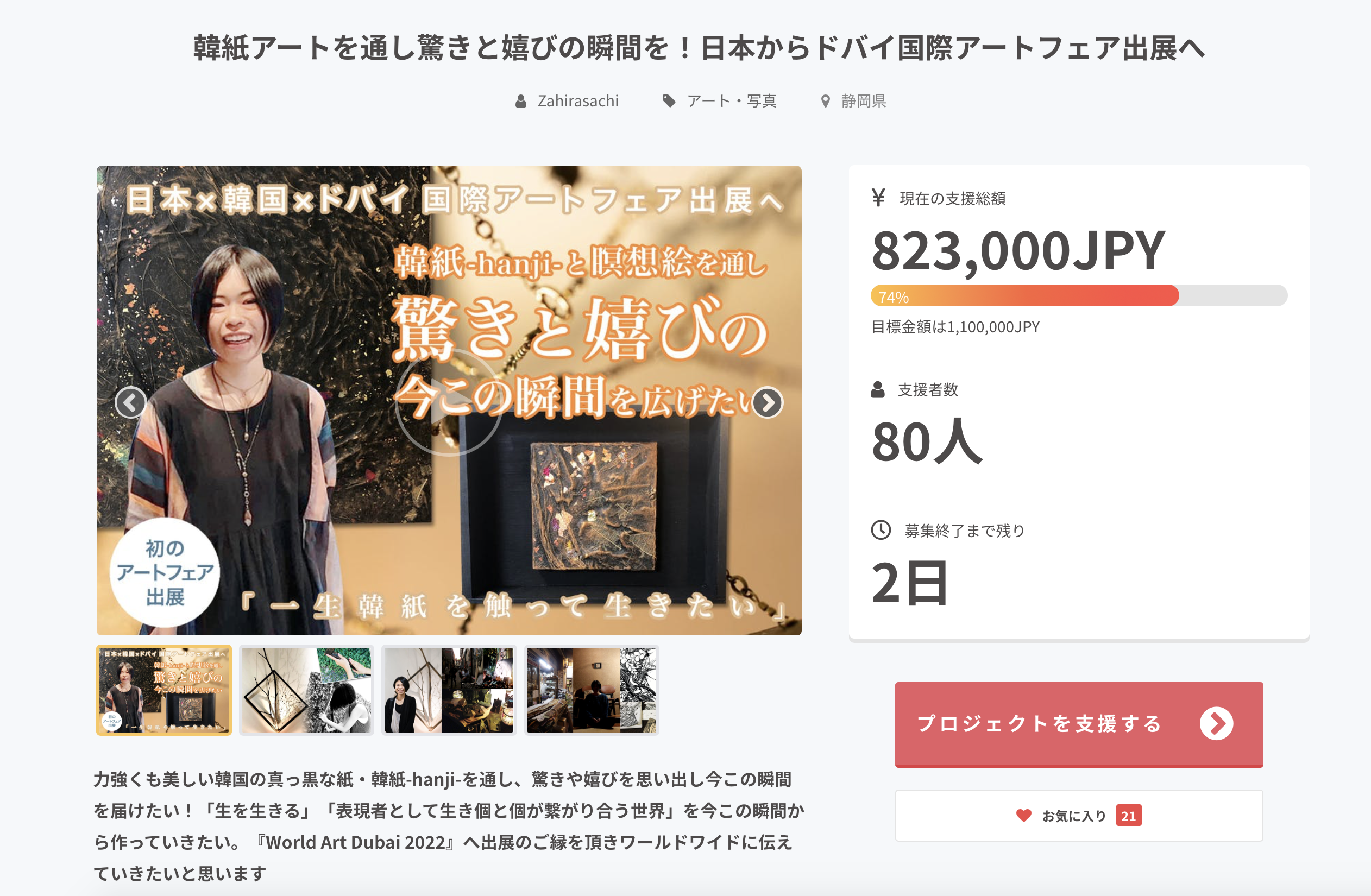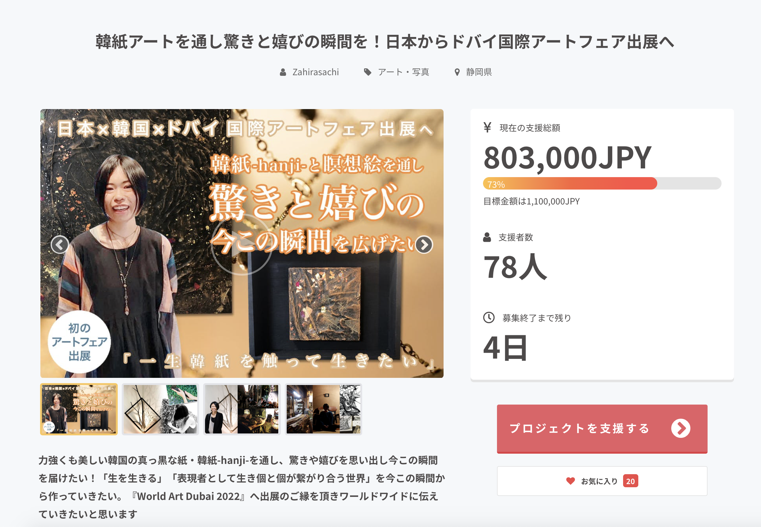クラウドファンディング、明日28日23:59まで!あと1日となりました!応援ありがとうございます。 クラウドファンディングを始めてからここまで、新たなこと目白押しで、面白いし楽しいんだけど、それまでにない体験だらけでエネルギーもう力尽きそう、、、と思うと、応援をいただいたり、そして後2日というところでまたインタビューライブ配信で話させてもらいまたブワッと!元気になり、そしたら応援のメッセージや、いいね!応援のシェア、さらにご支援をいただき、すごいの!!!それで、すっっっっごい元気になるの!!!もうこれはあれ!ドラゴンボールの元気玉ね!!元気玉って本当にあったんだ!!!とそんなことを思いながら目覚めた朝です。 ありがとうございます!! 昨日の1対1インタビューライブ配信なんて、初めてでドッキドキだったんだけど、すっごい話しやすくて楽しくなってしまってつい色々たくさん話しちゃいました。 3月16日~19日『World Art Dubai 2022』へ行くんだなあ、とここ数日でやっとリアルに感じはじめてきました。3月14日に渡航し6泊9日でドバイへ行ってきます。そしてやっと時差10時間以上あるのね~中東のドバイって暑いらしく、午後から動き出き出して深夜まで活動してるのね~など、調べ始めました。笑そのあとは、隔離も一週間あるので帰ってくる頃にはもう日本は暖かくなっているのでは?と不思議な感じです。 韓紙の「触れる絵画」をぜひドバイの方々にも実際に見て触れていただきたいと思っています。 初めてのドバイの国際アートフェア!というか、日本のアートフェアというものも行ったことがないのでどんな体験ができるのか、絵画の祭典というのがどんなものなのかとっても楽しみです! 日本人が韓国の素材を使い、ドバイで展示する、それはアートを通し、繋がり合うものを国を超えて伝えていきたらいいな、と切に願います。 動画では、ドバイ国際アートフェアについてや、『World Art Dubai 2022』への今の想いや、韓紙アートについて、「触れる絵画」を描く理由、など話しました。38分と長いので、家事や作業をしながら聞き流してみてもらえたら嬉しいです。https://www.youtube.com/watch?v=GWgyHlZmiKw ーーーーーーーーーーーーーーーーーーーーーー人が怖いと思っていましたが、『韓紙を通じて社会(人)と繋がり、驚きや嬉びという今この瞬間を届けたい!』『素材となる韓紙を知ってもらいたい!』韓紙(カンシ)アートを通し驚きと嬉びの瞬間を!日本からドバイ国際アートフェア出展へ∞クラファン挑戦中∞【明日28日23:59まで!】【リターン追加しました】https://camp-fire.jp/projects/view/542688