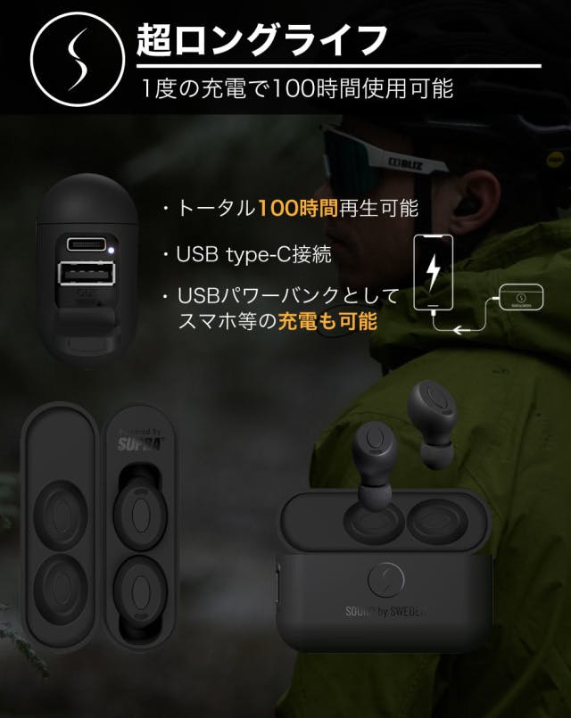 NERO-TX PROは内蔵バッテリーによりイヤホンを16回充電でき、1度の充電で合計再生時間は100時間(ケースでの充電を含む)使用可能です。