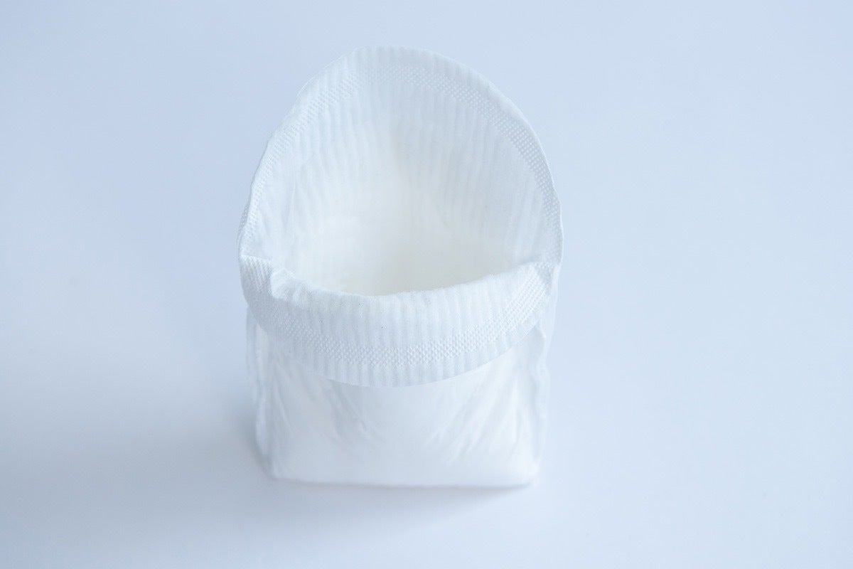 吸収性パッドの形状は「口を閉ざしたホタテ貝」を想起してください。美しい貝の中にたっぷりとあなたの尿を溜めこんで逃がしません。最大20ccも吸収する優れものです。