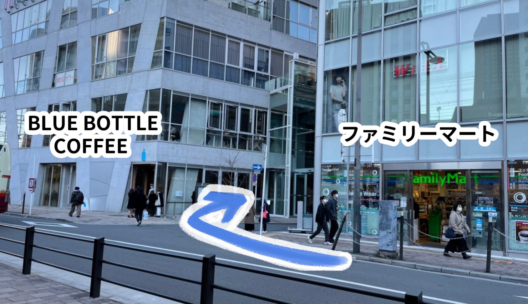 進んでいくとファミリーマートを曲がります。ファミリーマートの向かいにはブルーボトルコーヒーがあります。