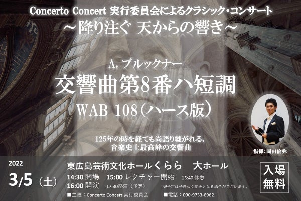我々からしても、お客様からしても、“ブルックナー”という普段聞かない作曲家の、長大な交響曲を演奏する機会、また、聴く機会は少ないと思います。しかし、このような状況下だからこそ、音楽が音楽である所以、音楽美を再認識し、音楽を体感することの素晴らしさを会場で共有していきたいと思います。レクチャーを行い、入場無料にすることで【格式高いオーケストラの、裾野を広げ、門戸を開く】我々の活動の意義を、この演奏会にて存分に発揮し、芸術文化振興の取り組みを東広島から発信いたします。