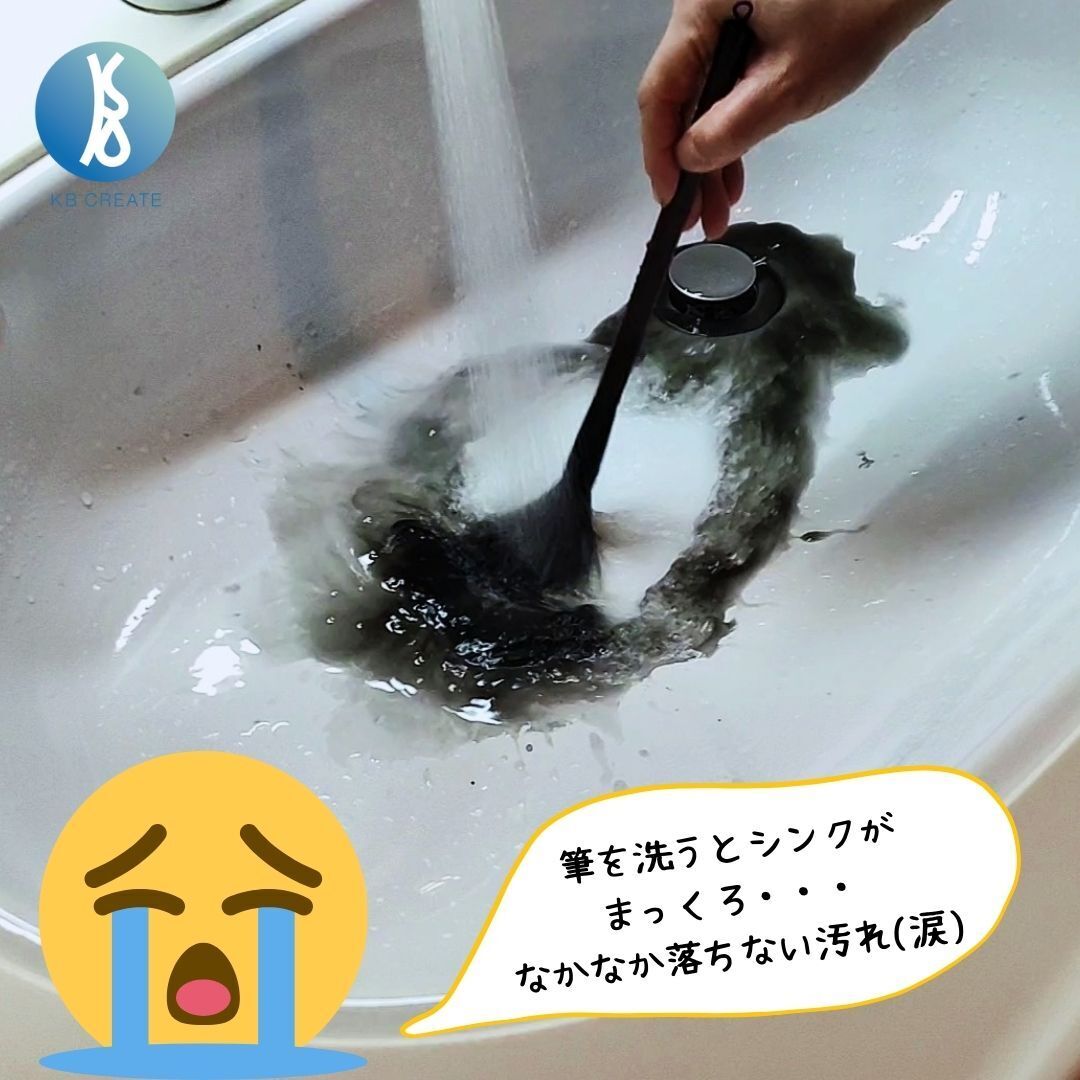 なぜかというと最近では習字の筆や絵の具用具は学校で洗わずに、子供たちに持って帰らせて家で洗ってくるようにという方針の学校が増えてきています。そうなると子供たちは家の洗面台やお風呂などの水回りで汚れた筆や絵の具用具を洗うので、真っ白なシンクが墨だらけ!なんてことも…。また墨の汚れはなかなか落ちないので掃除が大変。タオルや壁などの飛び散ったら泣きたくなります( ノД`)シクシク…