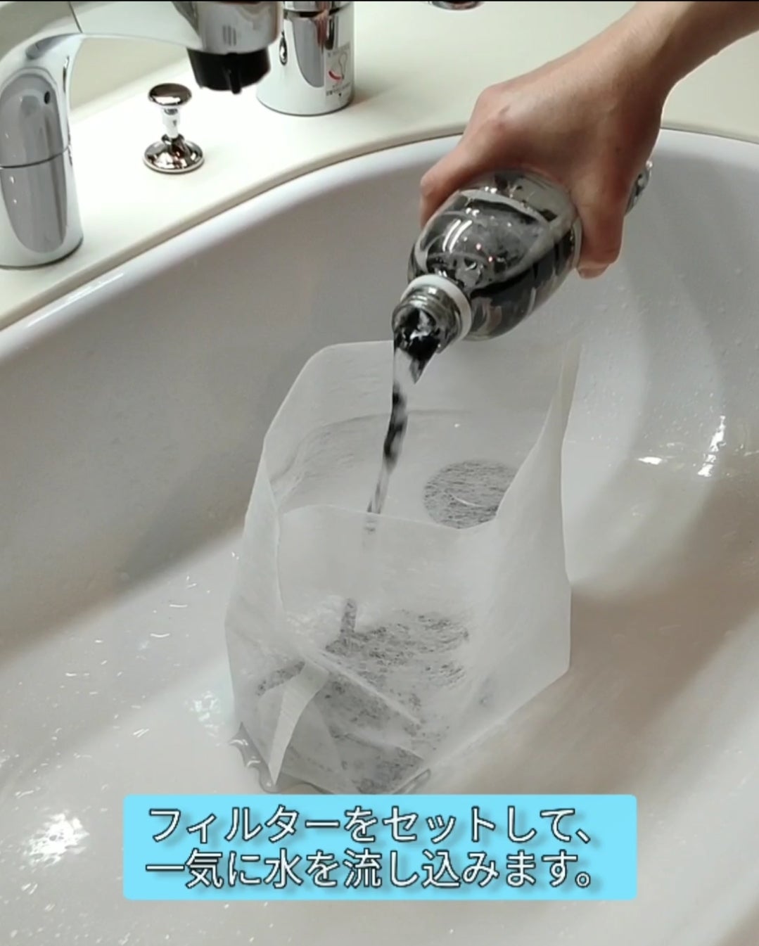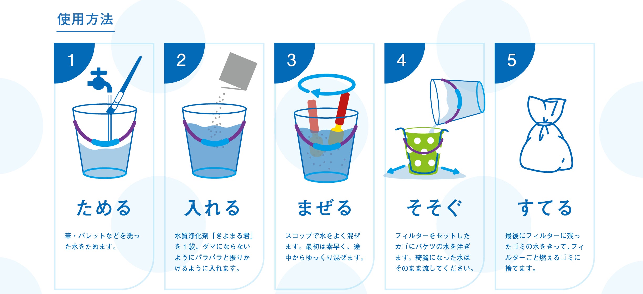 簡単に言うと、①汚れた水を貯める、②水質浄化剤『きよまる君』を入れる、③くるくる混ぜる、④汚れを濾す、⑤きれいな水を捨て、汚れはまとめて捨てる、この5ステップだけ。とっても簡単で安全。