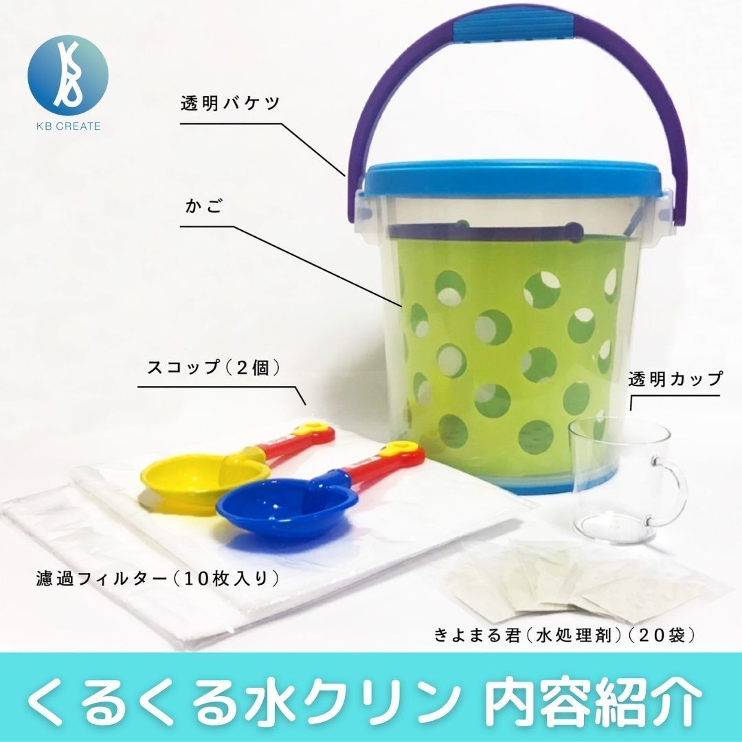 【セット内容】・蓋つき透明バケツ 1つ ・水切り用かご 1つ ・攪拌用スコップ 2本 ・濾過フィルター 10枚 ・きよまる君(水質浄化剤)20回分 ・透明カップ 1つ ・取扱説明書 1枚