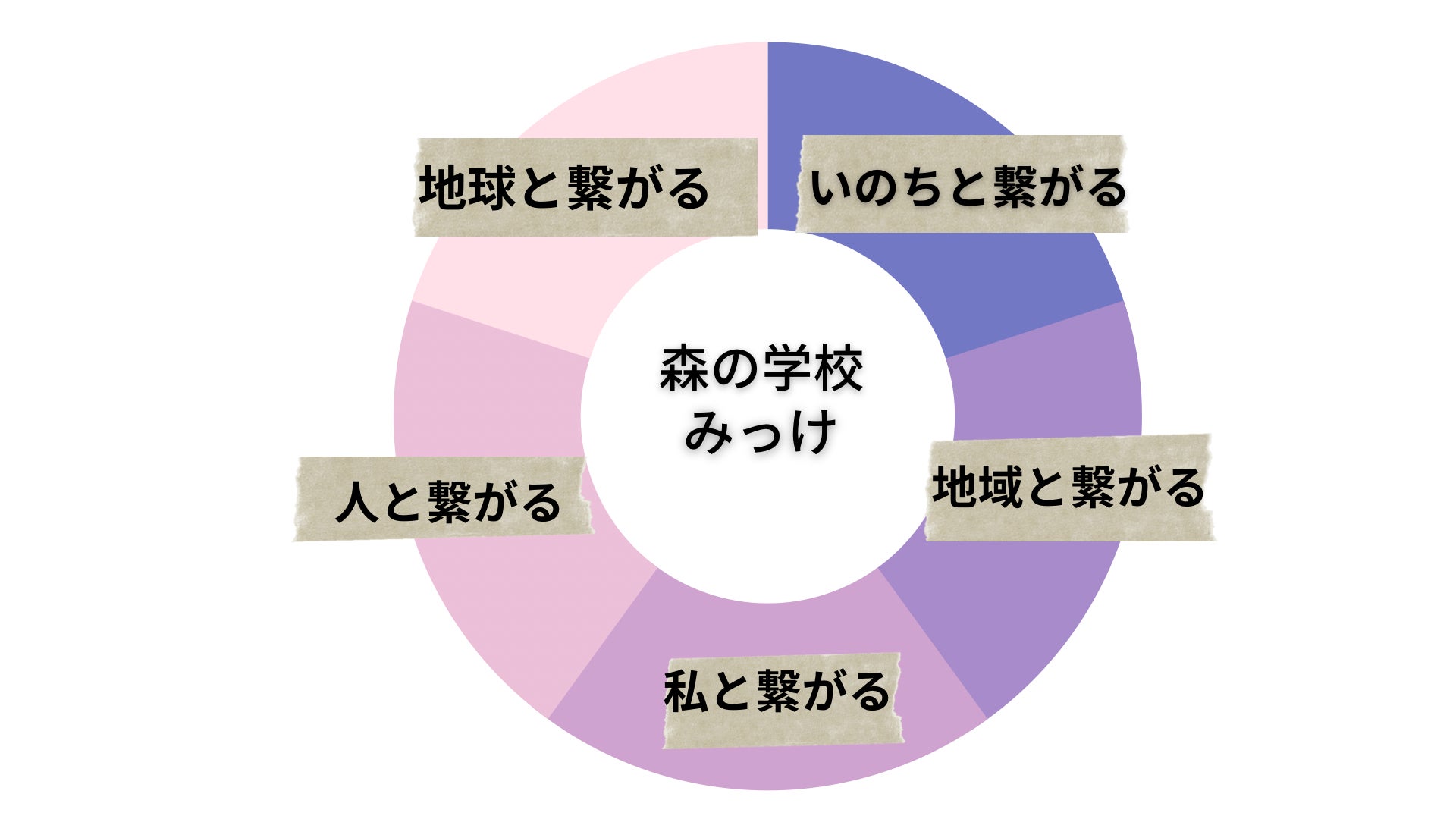 みっけは、自然の中で「人と人」「人と地球」の繋がりを紡ぎ、自分のわくわくを探究しながら、子どもも大人も共に学び、成長することを目指します。活動を通して紡ぐ5つの繋がりを紹介します。