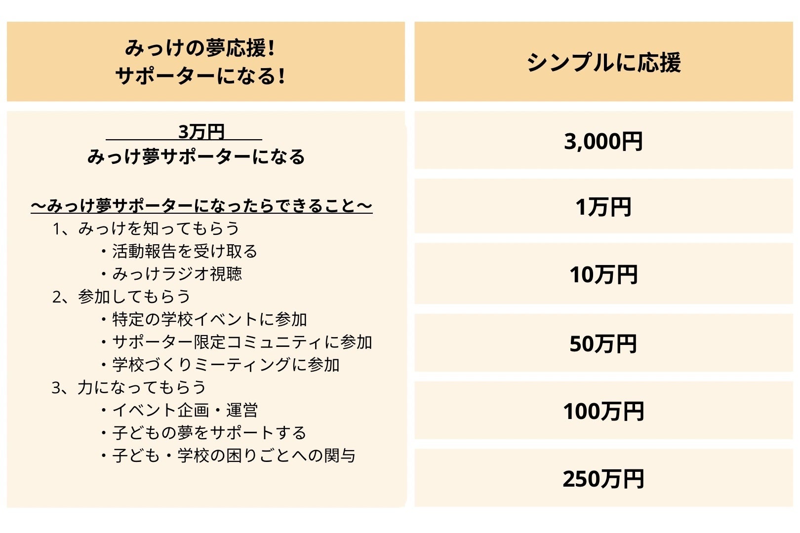 「子どもの夢のサポーターになる」コース、「シンプルに応援」コース、「みっけを体験」コース