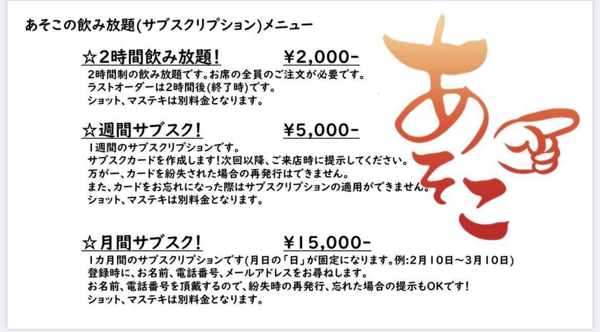 居酒屋あそこはドリンクの飲み放題(サブスクリプション)プランを3つご用意しております!