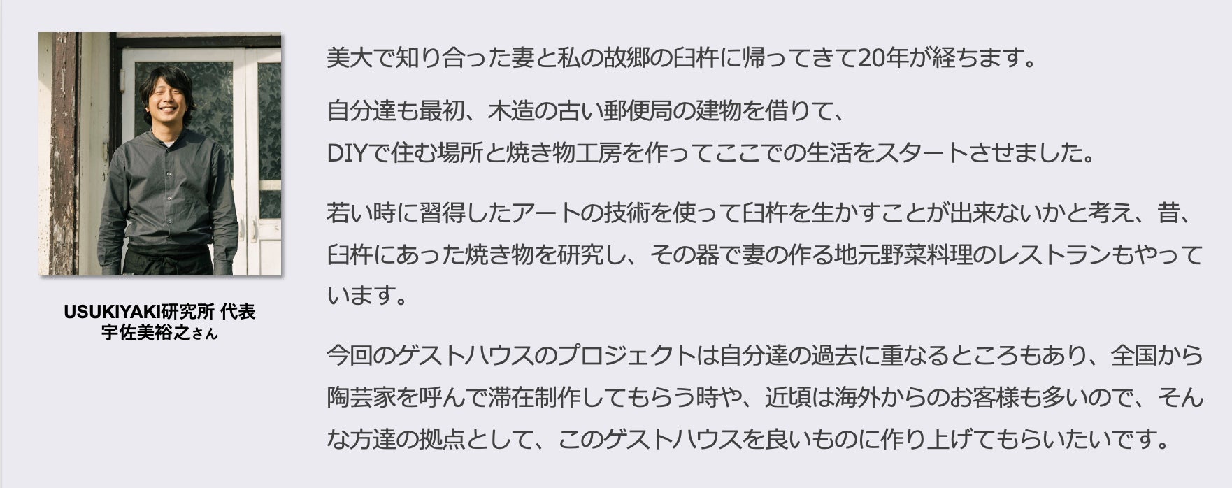 リターンの内容についてご質問いただきましたので回答いたします。 Q:USUKI ART HOUSE 滞在チケット1泊は一部屋に何人泊まってもこの値段ですか? A:申し訳ありませんが、このチケットは”お一人で1泊分の宿泊が可能なチケット”です。もし複数人でお泊まりの場合は、恐れ入りますが人数分ご購入いただけると幸いです。 また、6名様以上の場合は、「USUKI ART HOUSE 滞在チケット6回分」をお買い求めいただいた方が1万円ほどお得になりますので是非ご検討ください。 他にもご不明点ありましたらどうぞ遠慮なくお知らせください。いつもありがとうございます!
