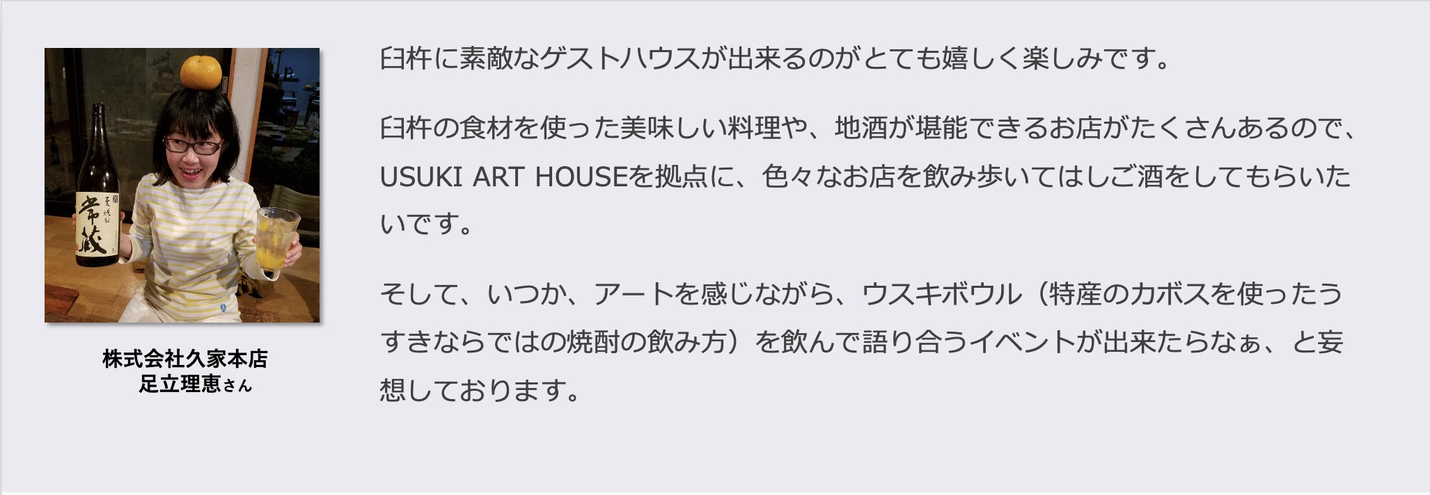 この拠点を通して臼杵市に興味を持つ人が増え、たくさんの人が実際に訪れ、人と人がつながって、街が元気になったら、これ以上の喜びはありません。