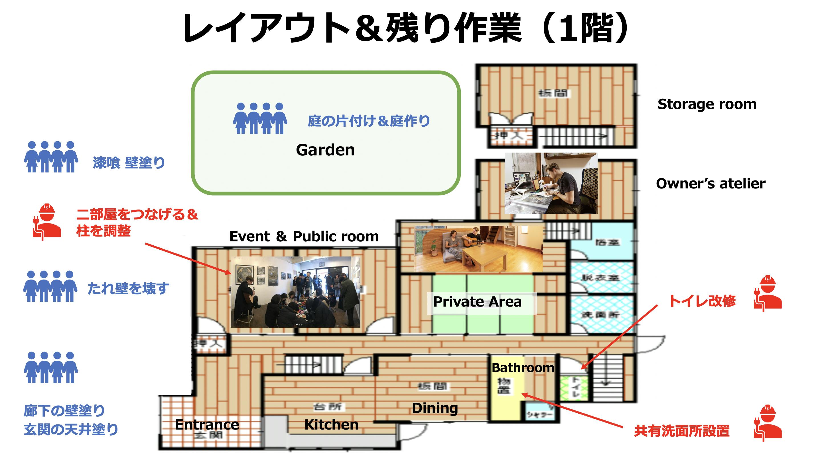 とはいえ、ここからゲストを受け入れる体制にするためには、まだまだたくさんの作業が残っています。プロに任せるところはお願いしつつ、自分たちでやれるところは、自分たちで作業してコスト削減。