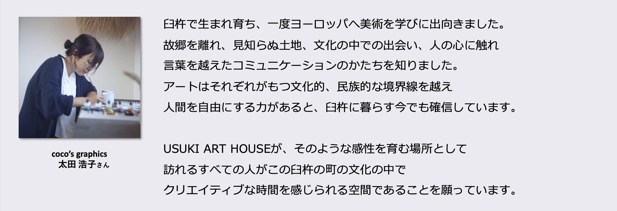 USUKI ART HOUSEのロゴは臼杵在住のアーティストcocosgraphicsさんや友人にも協力いただきながら、夫(AggelosProject)が創り上げました。