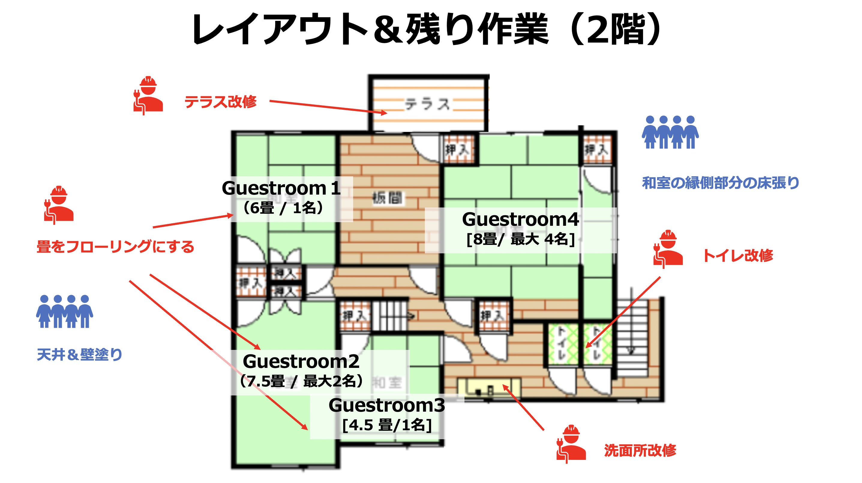 とはいえ、ここからゲストを受け入れる体制にするためには、まだまだたくさんの作業が残っています。プロに任せるところはお願いしつつ、自分たちでやれるところは、自分たちで作業してコスト削減。