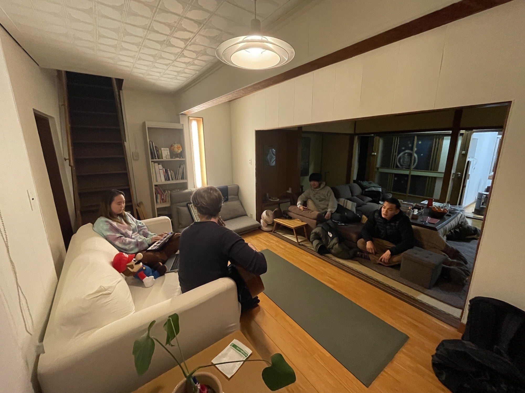 完成した共有スペースでDIYボランティアの仲間と音楽セッション♪