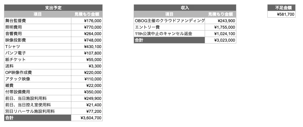 しかし、公演の中止などによるキャンセル費の発生によってサークルのお金が不足しており、実施できるか怪しい状況にあります。