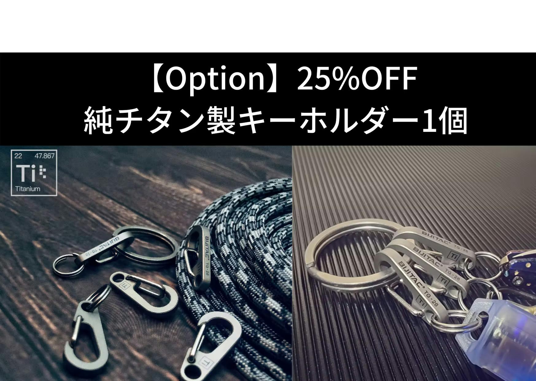オプションとして、25%OFF特価でチタンキーホルダーをご提供いたします。軽く、強く、海水にさらしても錆びない純チタンをさらに耐食性と剛性を高めたTC-4チタン合金を使用しました。ピカピカ光るニッケルやクローム製のステンレスリングとは異なるチタンならではの素材感や風合いが感じられるキーホルダーです。