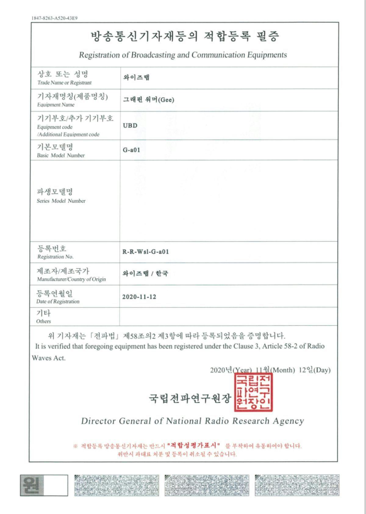 韓国国内で必要とされる認証や登録には以下すべて対応済です。なお、本製品はカーペット自体にバッテリーが付属しないため、PSEに関する対応は不要です。