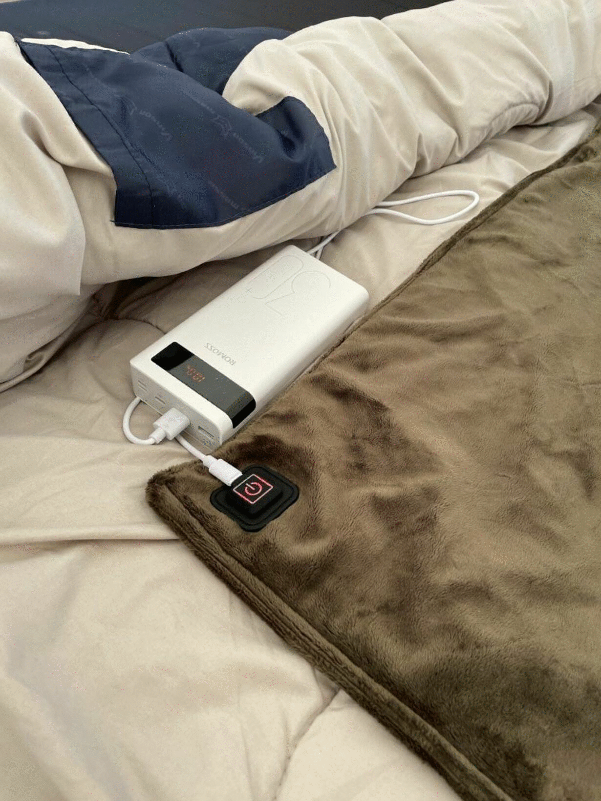 『Gee Camping 4-way Ultra Edition』はスマホなどを充電する5V2Aのモバイルバッテリーで3分以内に40度まで暖まります。
