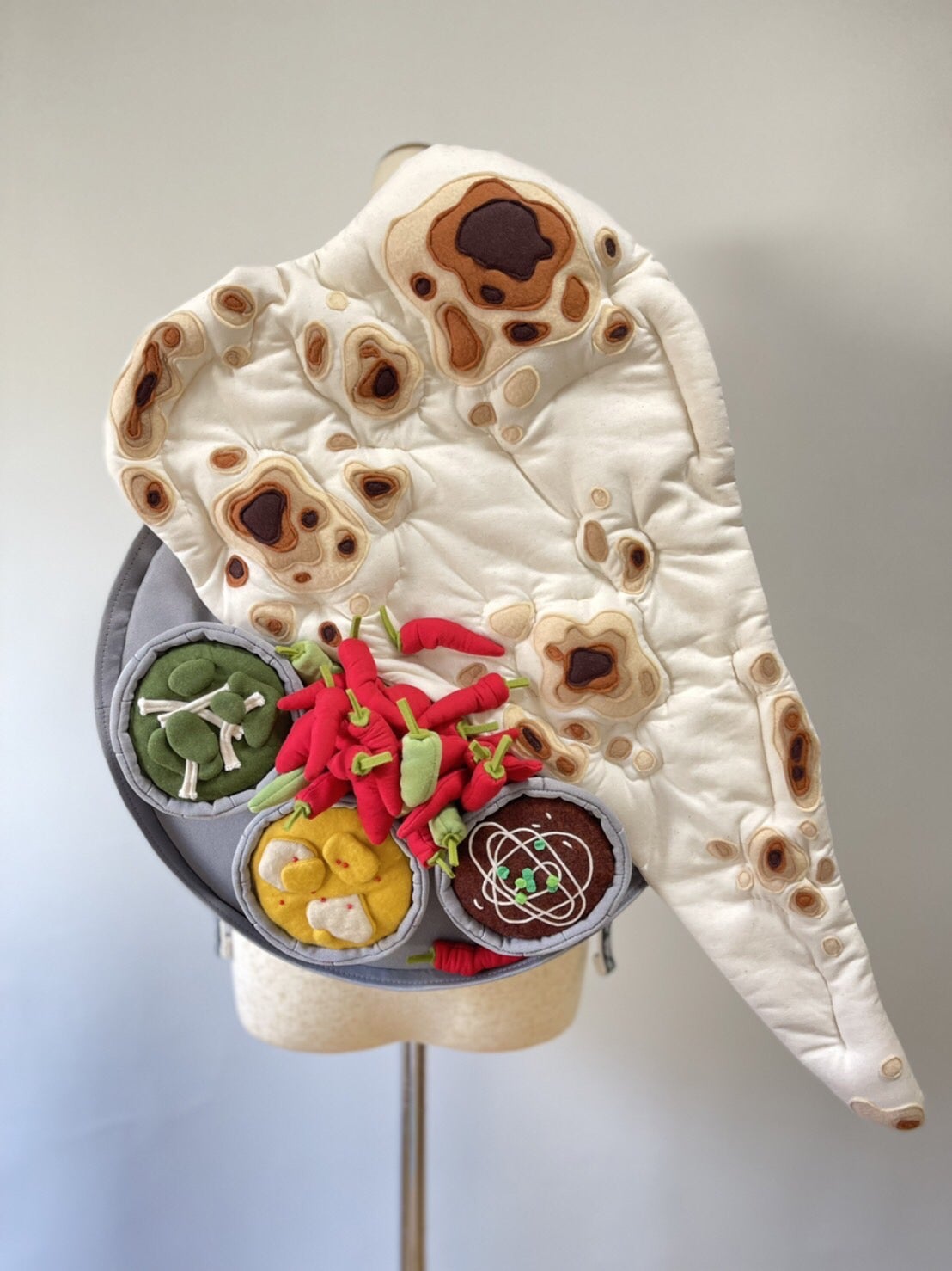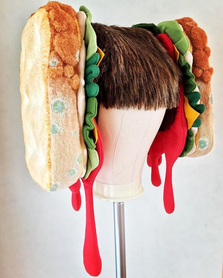 このほかにも「たこ焼き器型バッグ」や「一升瓶型バッグ」、「厚切りサンドイッチ型イヤーマフ」など可愛くて斬新な布モノアートを作り続けるコヤマさん👩