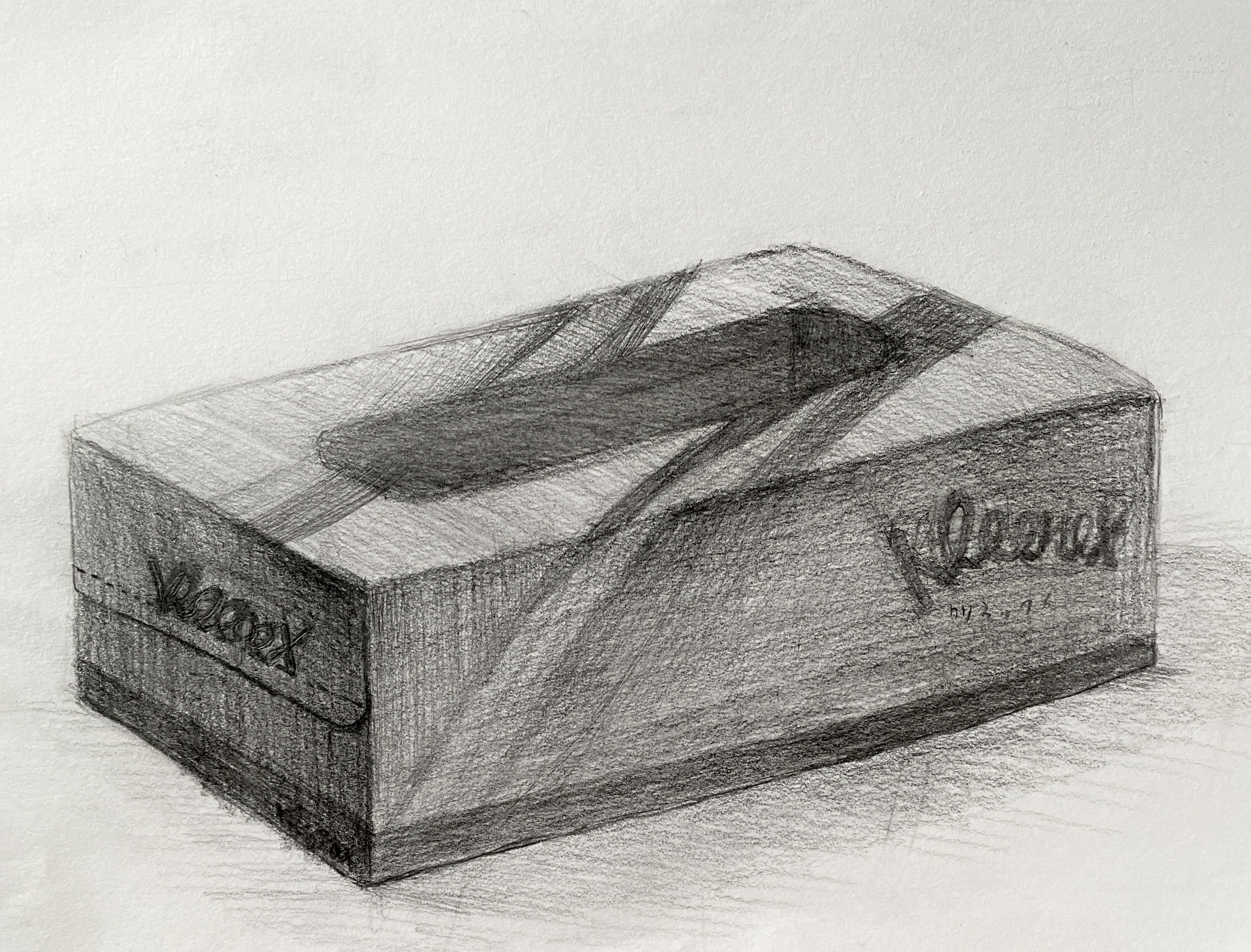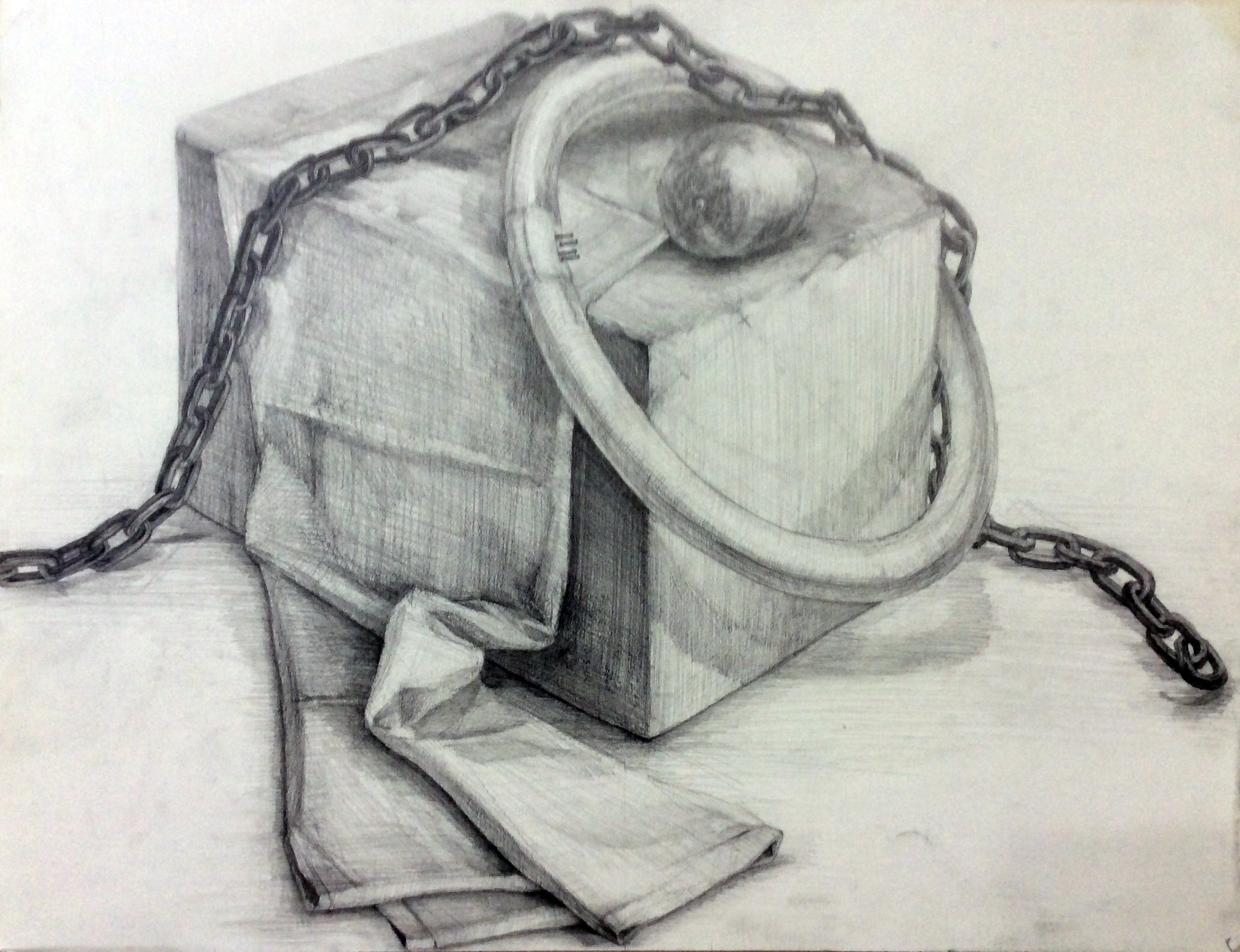 四角い石膏とチェーン、蛍光管とレモンのデッサン