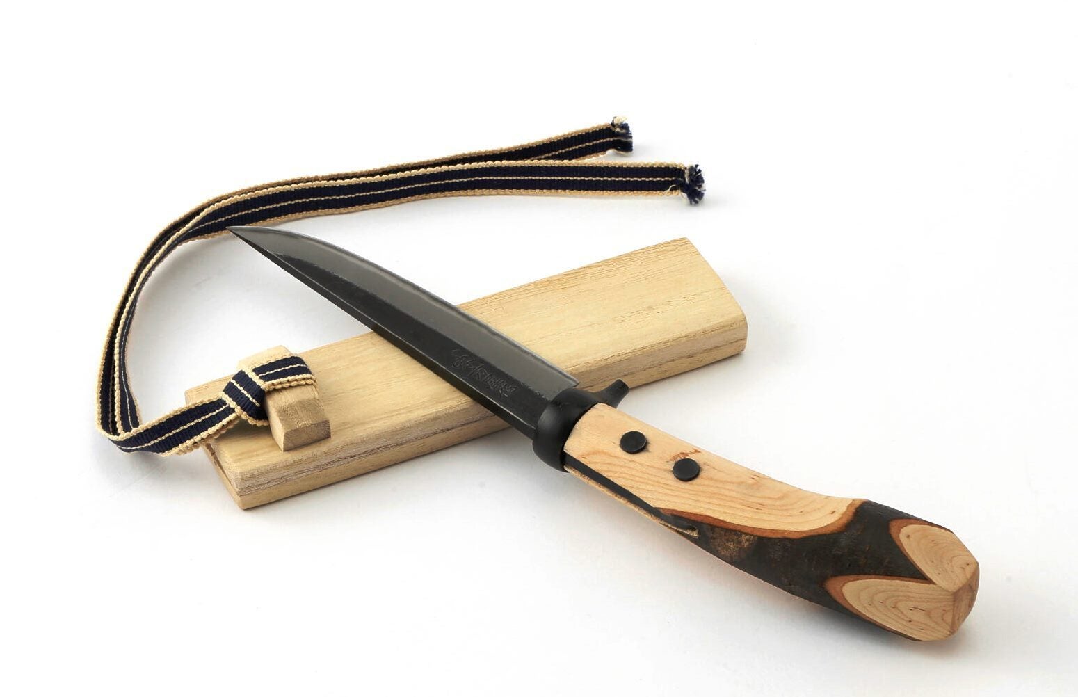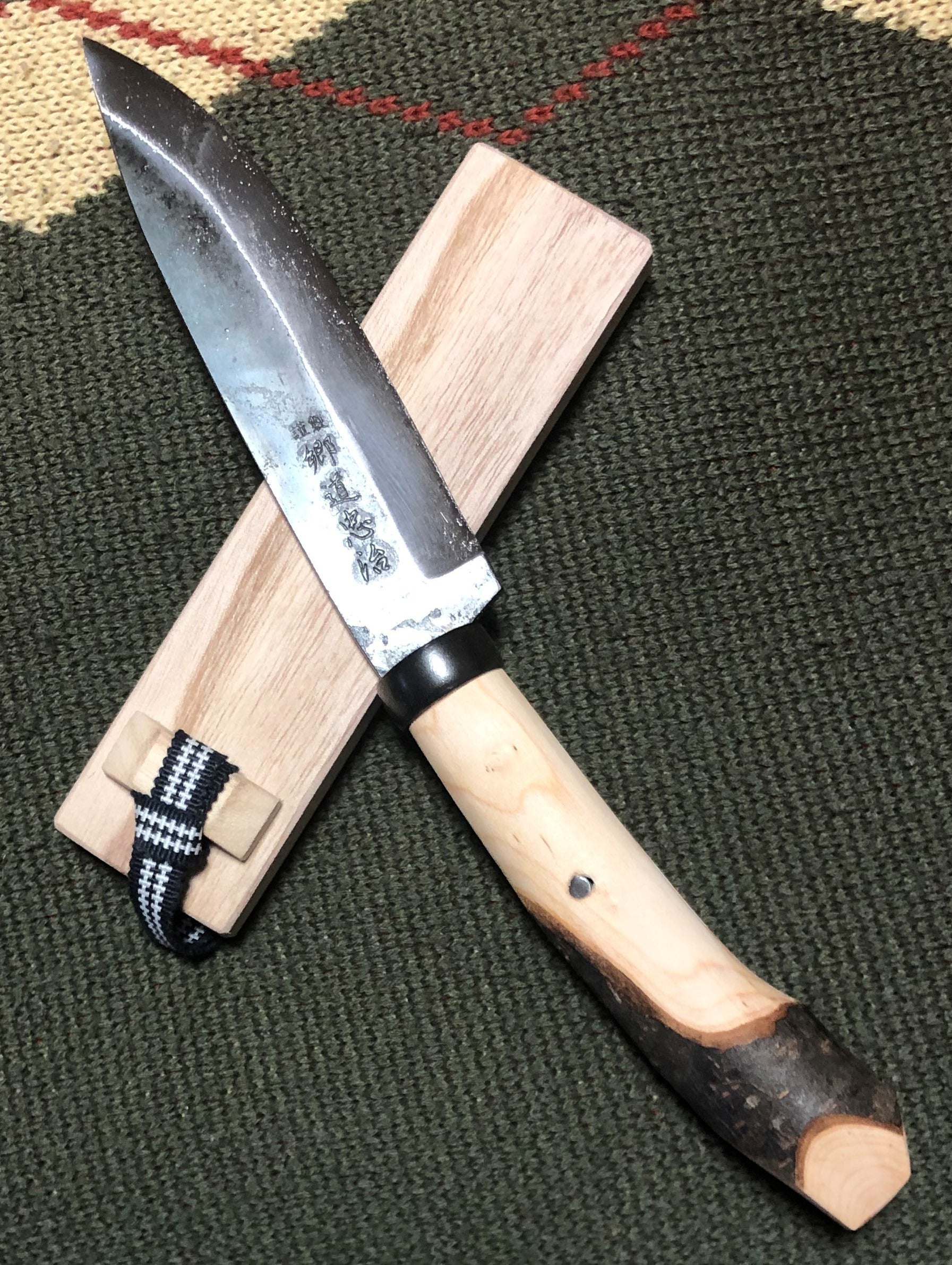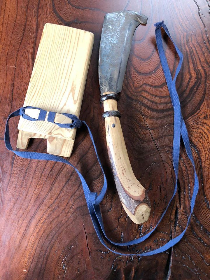 試作にあたり、当時スノーピークに努めておられて、以前から懇意にさせて頂いている U氏から、「渓流釣りに携行できるサイズ感と水に強い木鞘の剣鉈が良い」との監修を受け、先ず三条市の名工に依頼した剣鉈の刃は、刃厚4mm以上、刃渡りは五寸(150mm)で研ぎやすく、しかも長切れする鋼材を採用してもらいました。