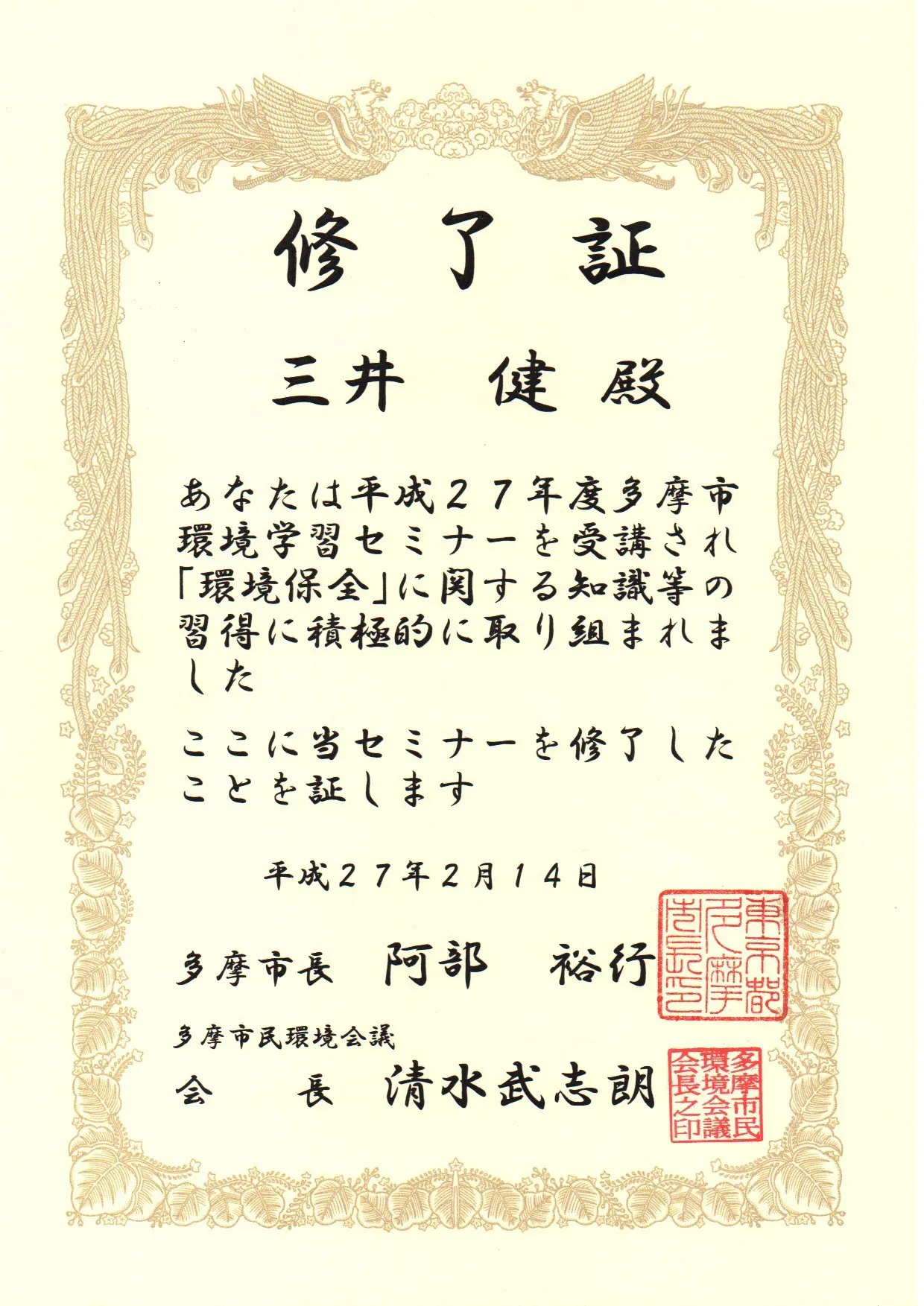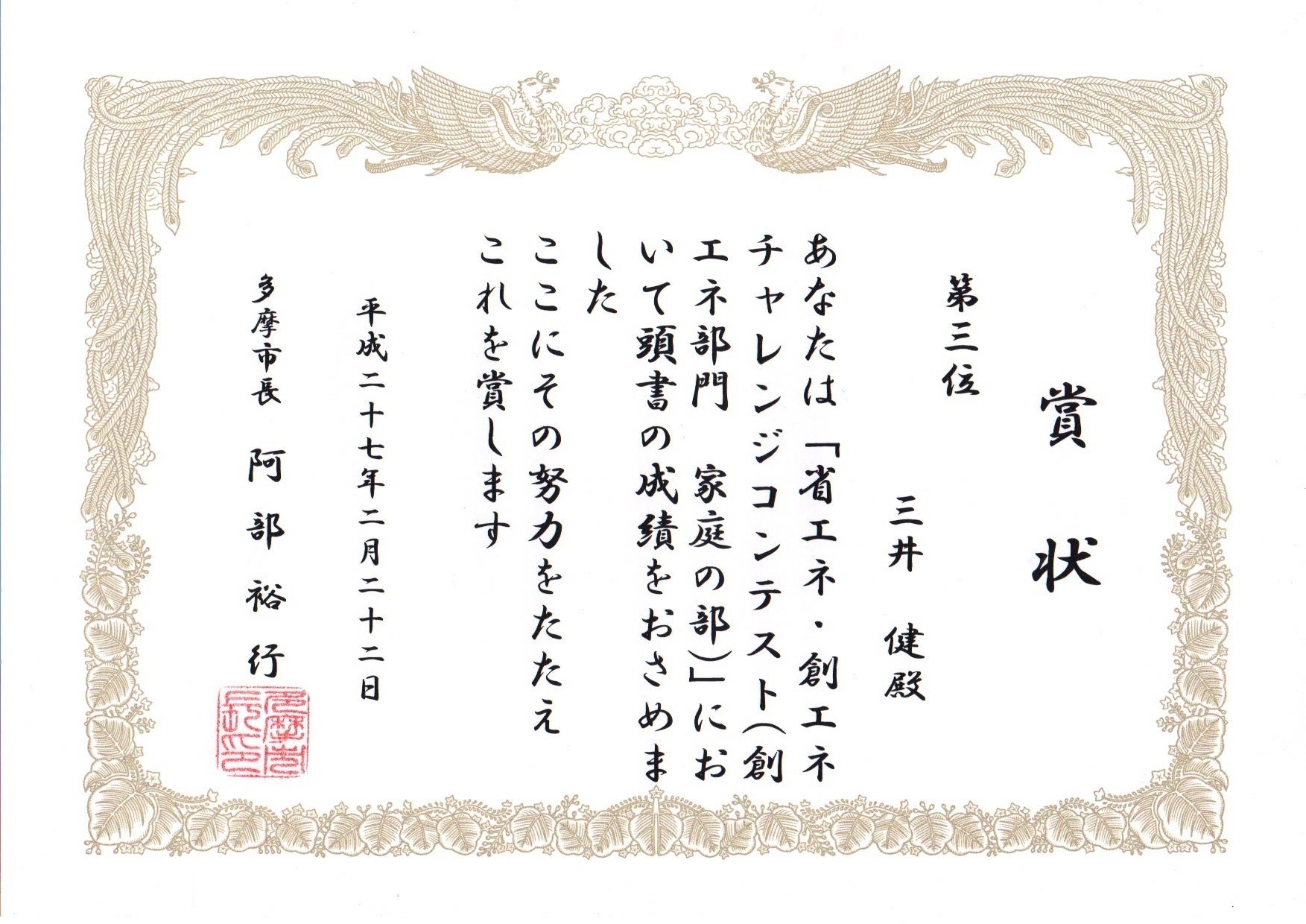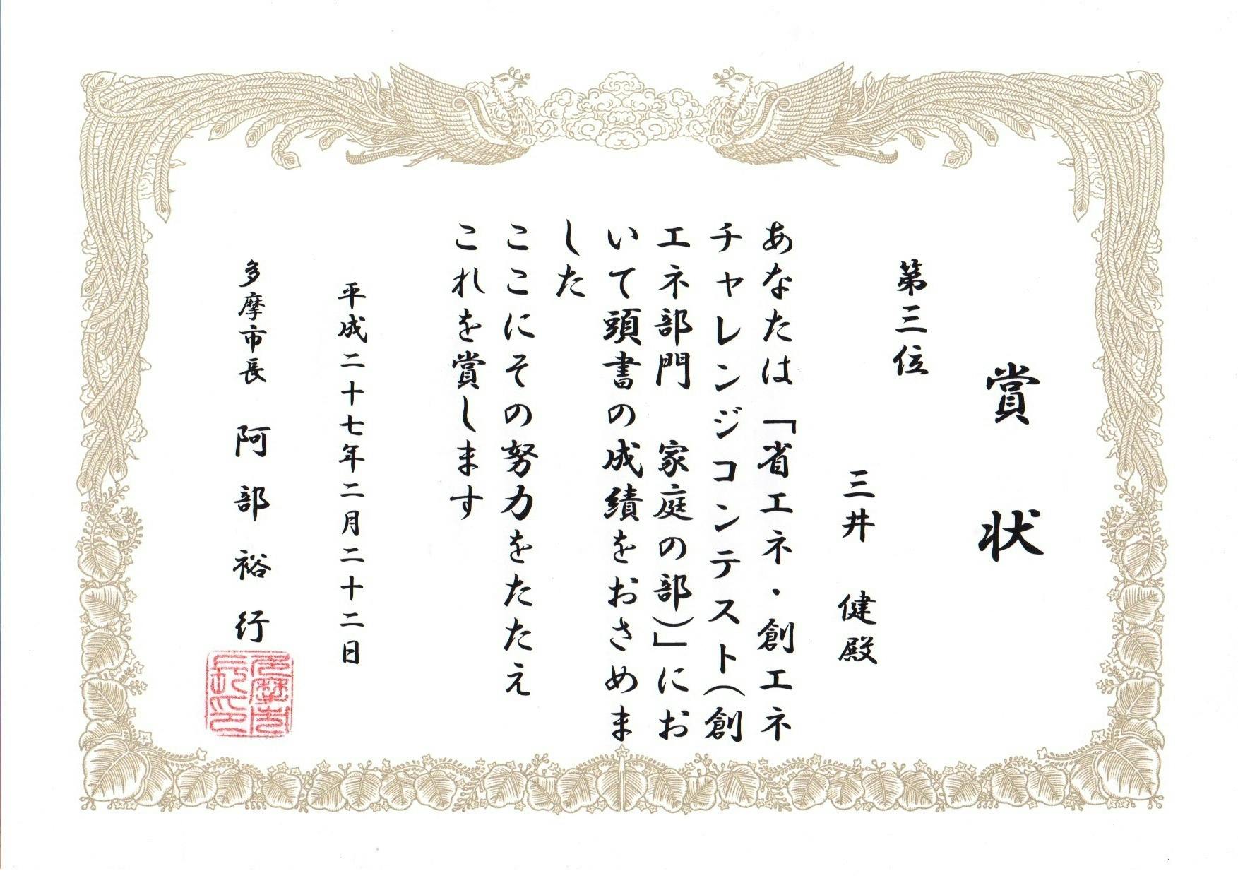 太陽光発電創エネ部門で多摩市内で3位に入選