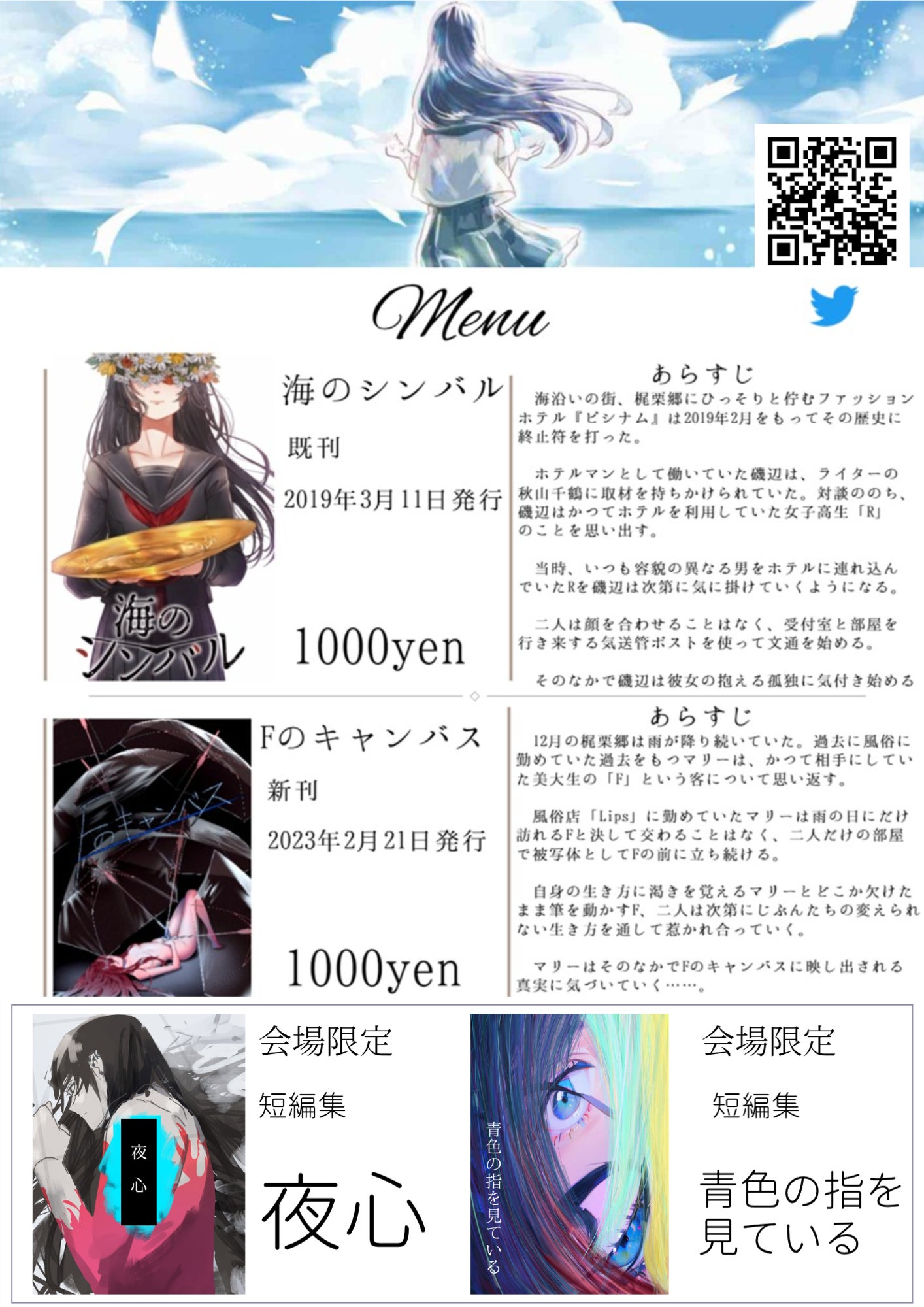海のシンバル・Fのキャンバスのほか、会場限定短編小説「夜心」「青色の指を見ている」も限定30部で持っていく予定ですので何卒よろしくお願い申し上げます!