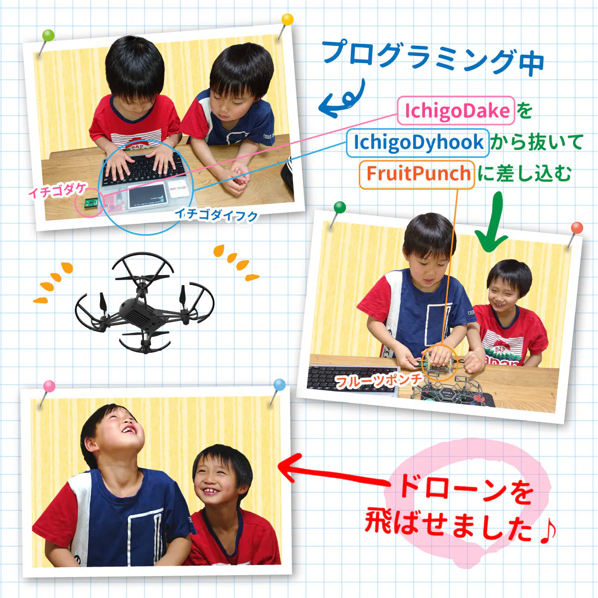 2022/02/14 09:31ドローン教育プロジェクトのお手伝い昨年秋から桃山学院教育大学の皆さんは「ドローンの可能性やプログラミングを学ぶワークショッププログラム」の作成に取り組まれています。僕はアドバイザーという立場で関わらせて頂いているのですが、「まぁおもしろい!」先日リハーサルに立ち会いましたが、「やっぱりこんなコースはどうかな?」「説明をするときにはもっと語りかけるように!」等々、学生達の意欲的な姿勢にふむふむと関心していました。リハーサルの様子当日子どもたちに"かっこ良いところをみせれるように?"ドローンの操縦練習もレース形式で行いました。コースは「教室→廊下→教室」一進一退のレース展開となり、すっごく盛り上がりました♪ドローンレースの様子その後はプログラミング制御の演習。ここでももちろんチーム対抗戦で、大盛り上がりでした!ドローンプログラミングの様子さいごに本ドローンプログラミング教育プロジェクトの活動を通して、FruitPunchでの教科書作成における新たな発見がありました。例えば、「淡々と使い方やプログラムを記載するのではなく、いかに子どもたちに気づきを与え、自発的に取組みを促せるかが大切」などです。今後も実現場での体験を活かしつつ、FruitPunch教科書作成に取り組んで参ります。さいごに、桃山学院教育大学 木村先生、プロジェクトメンバーの皆さん、このような機会を頂きありがとうございました。ぜひプロジェクト達成しましょう! もっと見る