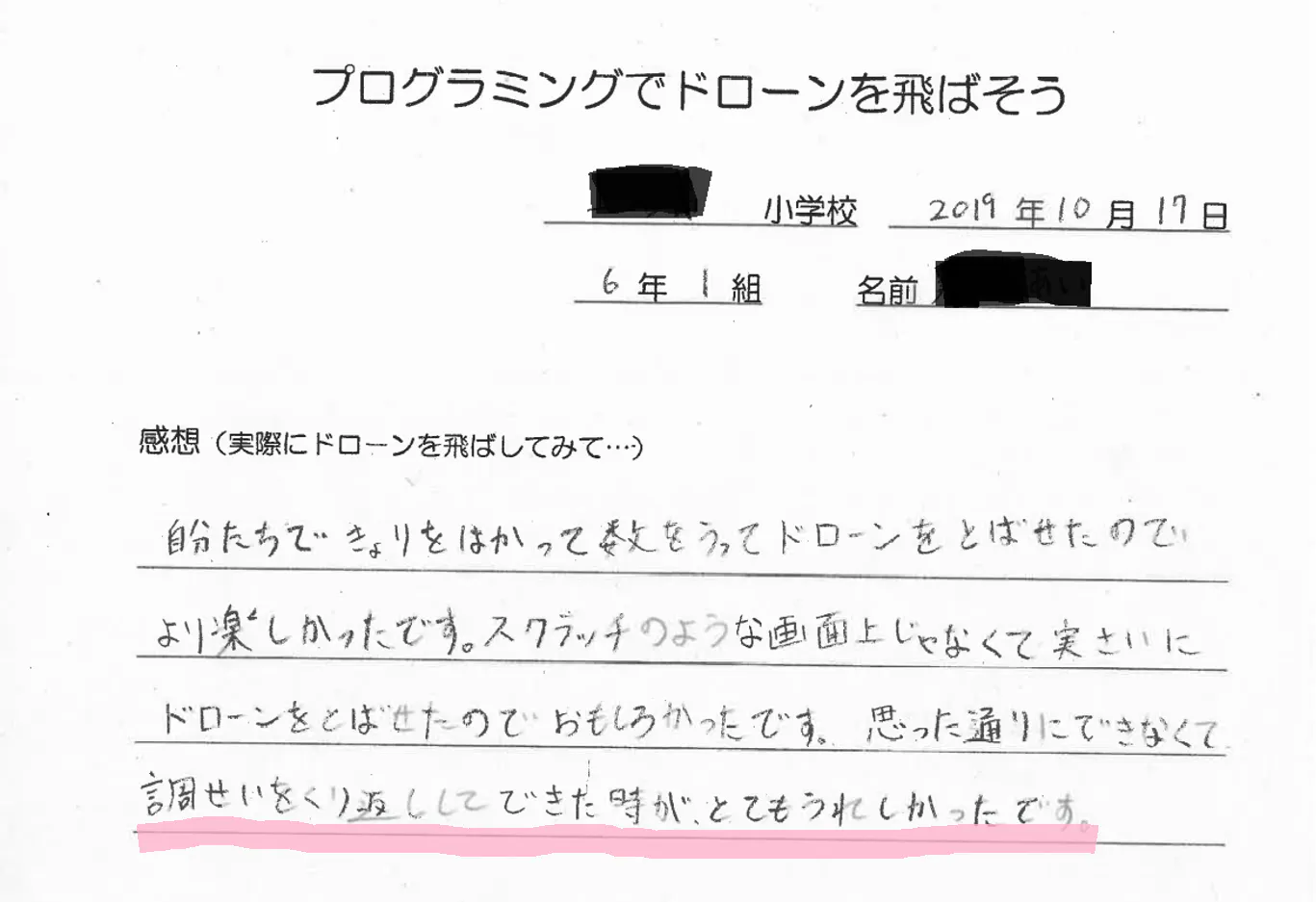 ドローンプログラミング授業体験後の生徒感想文