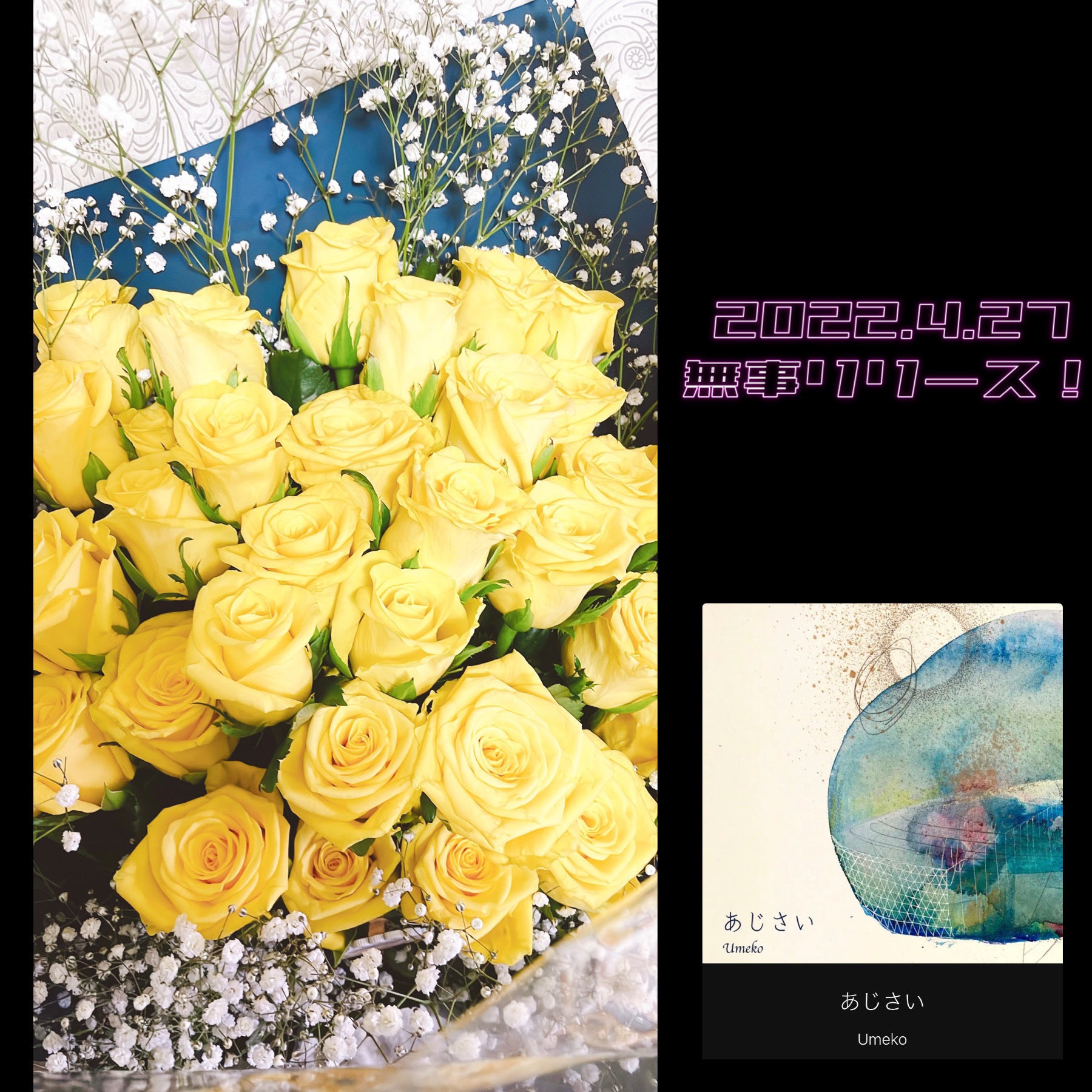 2022/04/28 11:29遂に!4月27日無事リリースされました!各ダウンロードサイト、サブスク等で購入等が可能になりました!すごく感慨深く、これまで好きなアーティストさん達の楽曲を購入していたのと同じように、自分の楽曲が検索され出てくる。。どこか他人事のような感覚になりつつも、感激しております。既に、CDで持ってくれている人たちもダウンロード購入してくれている方もいてこうして広がっていってくれたらと思うのです。▼各種リンクはこちらhttps://linkco.re/UGRf2bDZそしてここ1~2週間は、素敵なご縁でお声がけいただきラジオやライブなど活動させていただいておりました!4月15日(金)NHK-FM 花ラジちば └作曲者である声松優一さんがゲストパーソナリティを務められており電話出演させていただきました。4月20日(水)渋谷クロスFM 鳥羽明美のミラクル☆クルクル └Mystieふまさんに17LIVEで出会い、スタジオ出演させていただきました。(左)Mystieふまさん (右)鳥羽明美さん4月23日(土)神戸 原点回帰 └17LIVEにてバシ丸の介さん主催の【原点回帰】というイベントがありクリエーターと音楽を融合させたベントのミュージックステージにお誘いいただきました。声松さんにも一緒に参加いただき30分のステージをさせていただきました。初めての遠征ライブで、たくさん盛り上がっていただきました!4月27日(水)エフエム戸塚 イブニングステーション └17LIVEで古墳の発信をしている配信で出演者として知り合い、初めてラジオ出演のオファーをくださった椿優衣さんの番組にスタジオ出演させていただきました。そしてまさかの、長く傍にいて応援してくれているリスナーさんが遊びに来てくださいました!・・・バラ40本をもって!!笑そういうユーモアのあるリスナーさんがいてくれるのは嬉しいです!こんな大きなバラを持っていたら、通りすがりの女性がどうしたの!?と声をかけてくださり誕生日にリリースにラジオにトリプルでおめでたいわねとハッピーバースデーを歌ってくださりました♪こうやってご縁があるのもありがたいですね♪どこかで〈あじさい〉を聞いてくださいますように。この数週間、自然と舞い込んできたラジオやライブは自然と〈あじさい〉のリリースプロモーション活動になりました。こんなことがあるのかと、とても嬉しく、リリースが決まってもこんなに幸せなことがあるだろうかと日々過ごさせていただきました。現在の予定上、最後のイベントは30日の14時からバースデーリリースライブペイントライブを17LIVEで配信いたします♪ぜひお楽しみに♪---------------------------------今回の活動においてかかりました費用は、みなさまにご支援いただいた資金の中から、プロモーション活動費として使用させていただきました。皆様のご支援があったからこそ、迷わずこの活動をお受けすることができ全力で活動することができました。本当にありがとうございます。---------------------------------デジタルリリースもされ、ここからがまたスタートです。たくさんの方に届きますように。 もっと見る
