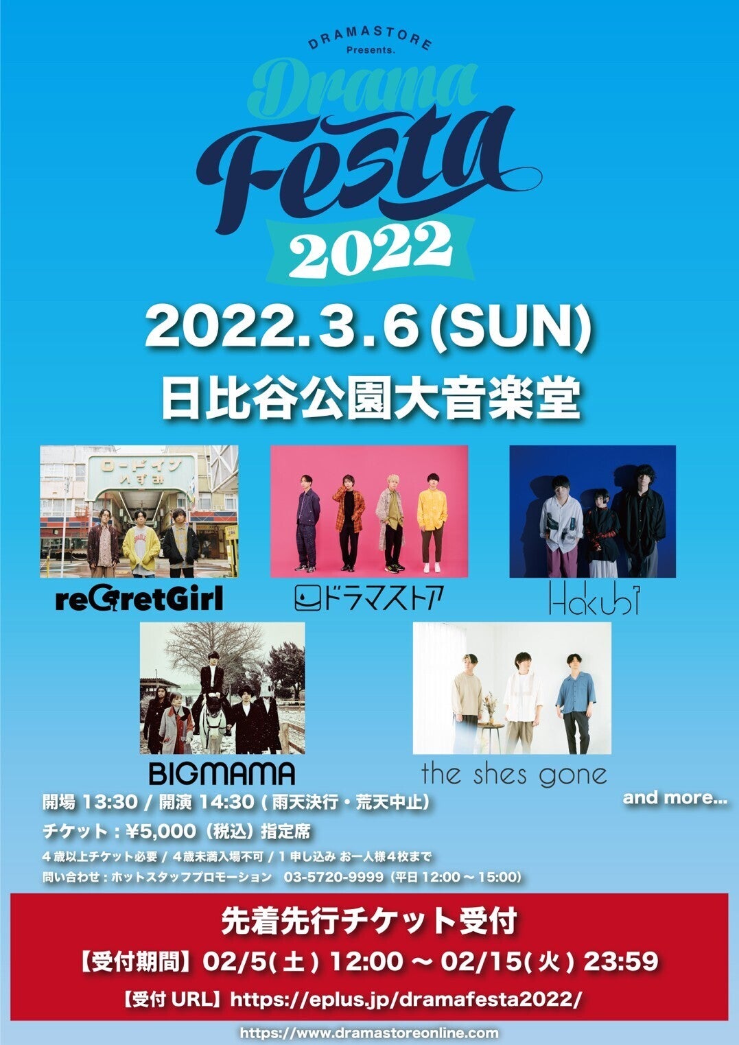 本日、只今から先着先行の受付が開始されました!DRAMA FESTA 2022日比谷公園大音楽堂2022年 3月 6日(日)開場:13:30/開演 14:30チケット:指定席 ¥5,000(税込)※4歳以上チケット必要/4歳未満入場不可※1申し込み お一人様4枚まで出演者:ドラマストア、BIGMAMA、reGretGirl、the shes gone、Hakubi、and more.... 先着先行受付中: 2/15(火)23:59まで イープラス先着先行チケットご購入お申し込みはこちら※受取方法:紙チケット+スマチケ両方