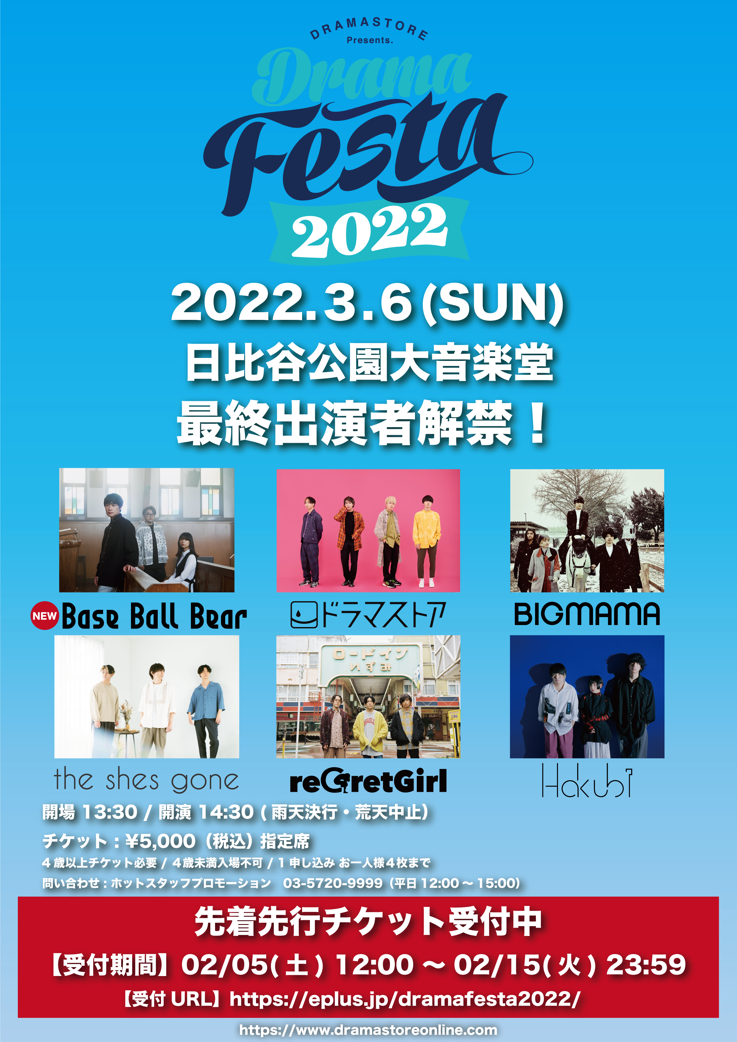 最終出演アーティスト解禁!!!「Base Ball Bear」DRAMA FESTA 2022日比谷公園大音楽堂2022年 3月 6日(日)開場:13:30/開演 14:30チケット:指定席 ¥5,000(税込)※4歳以上チケット必要/4歳未満入場不可※1申し込み お一人様4枚まで出演者:ドラマストア、BIGMAMA、reGretGirl、the shes gone、Hakubi 先着先行受付中: 2/15(火)23:59まで イープラス先着先行チケットご購入お申し込みはこちら問い合わせ:ホットスタッフプロモーション 03-5720-9999(平日12:00~15:00)会場でお待ちしております!!!