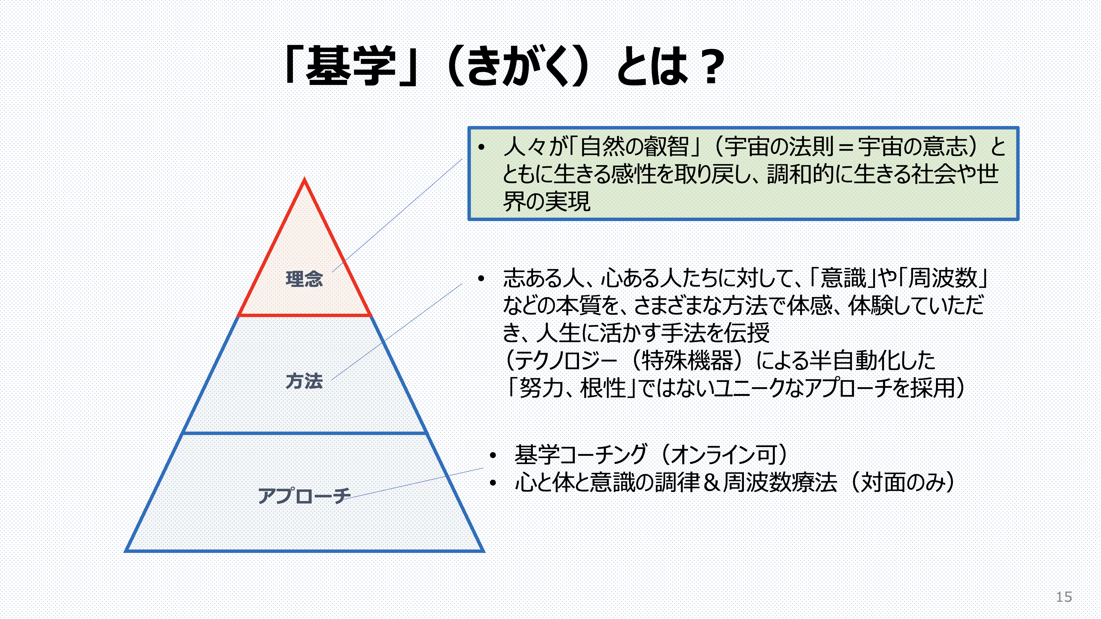 「基学」では、「意識のフォーカスを半自動化」する仕組みや周波数療法も取り入れながら、自分の心の声に従って、社会に貢献したい、世の中をよくしたいという志のある方を、「努力や根性」論ではない、ユニークな方法でサポートさせていただきます。