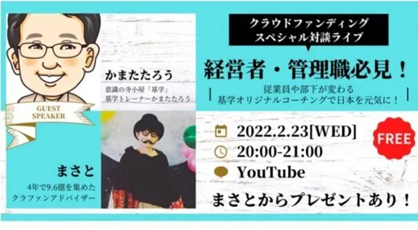 とんとん拍子で話が進み、何と明日、2月23日(水)午後8時から、クラファンコンサルの「まさと」さんとのYouTubeコラボ対談が決まりました。
