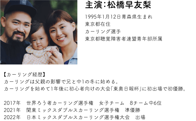 若いろう夫婦である松橋さん(聴こえない)が1歳の聴こえる赤ちゃんを育てています。母であり、カーリング選手でもある松橋早友梨さんにフォーカスし、ドキュメンタリーという形で皆さまにお届けします。子育てやカーリングというスポーツを通して、この作品をご覧になる皆さまには、きっと何かへの『気づき』があることでしょう。