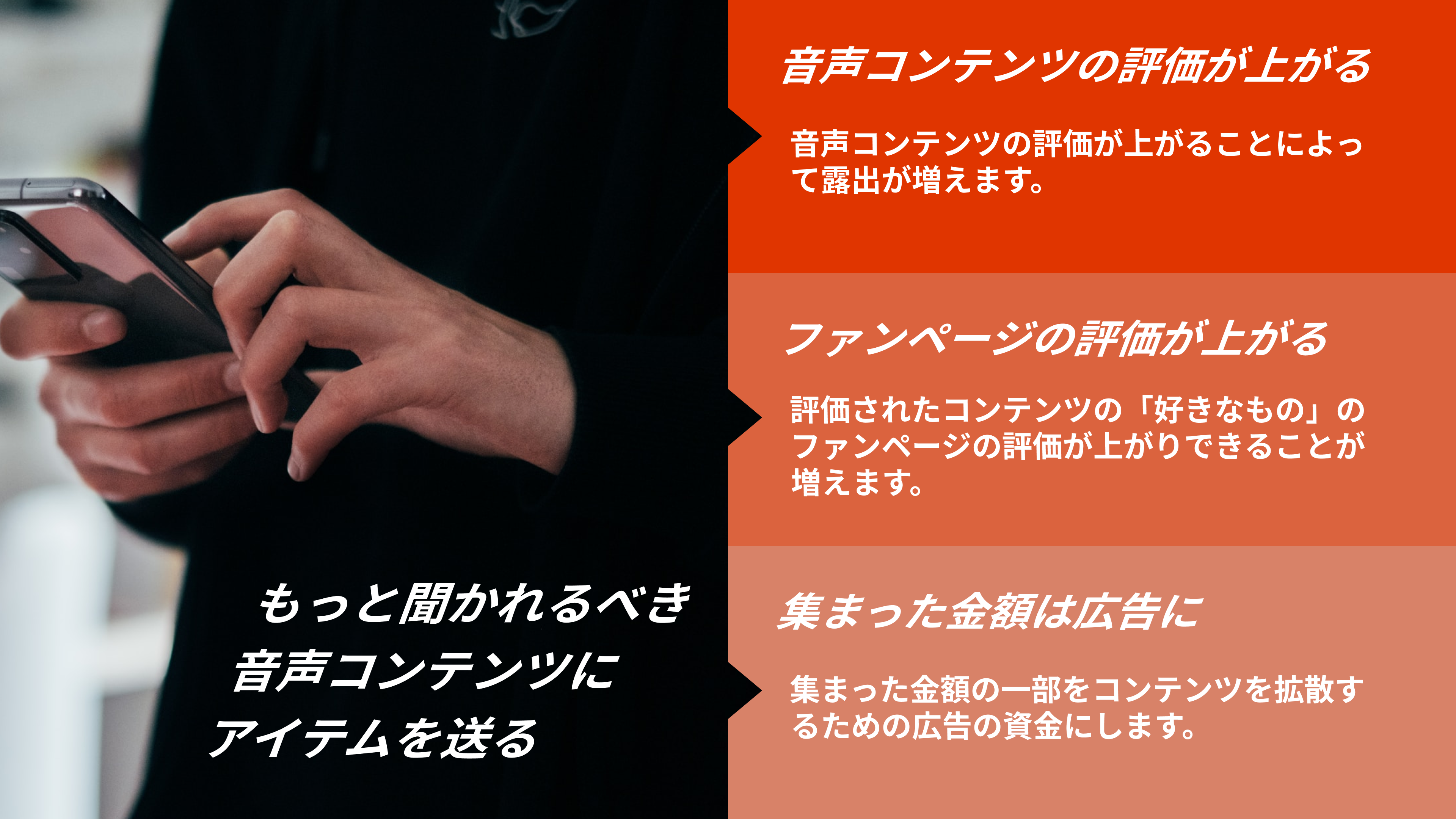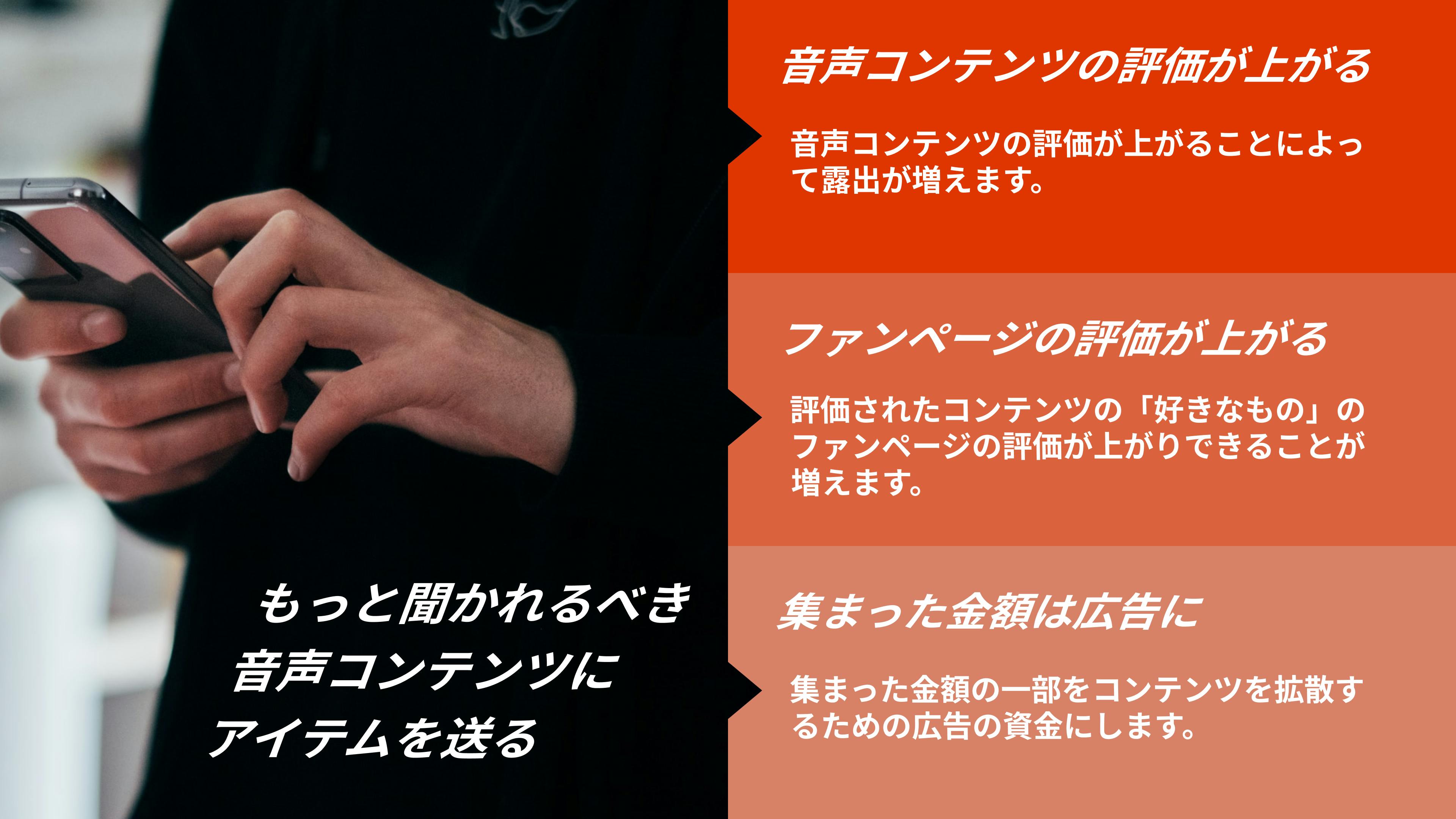 音声コンテンツを楽しんだ人が「このコンテンツはもっと知られるべき!」と思うコンテンツに投げ銭のようにアイテムを購入し送ることで、コンテンツの露出を増やすことができます。このアイテムの量によって、コンテンツと「布教用まとめ」の評価が上がっていきます。