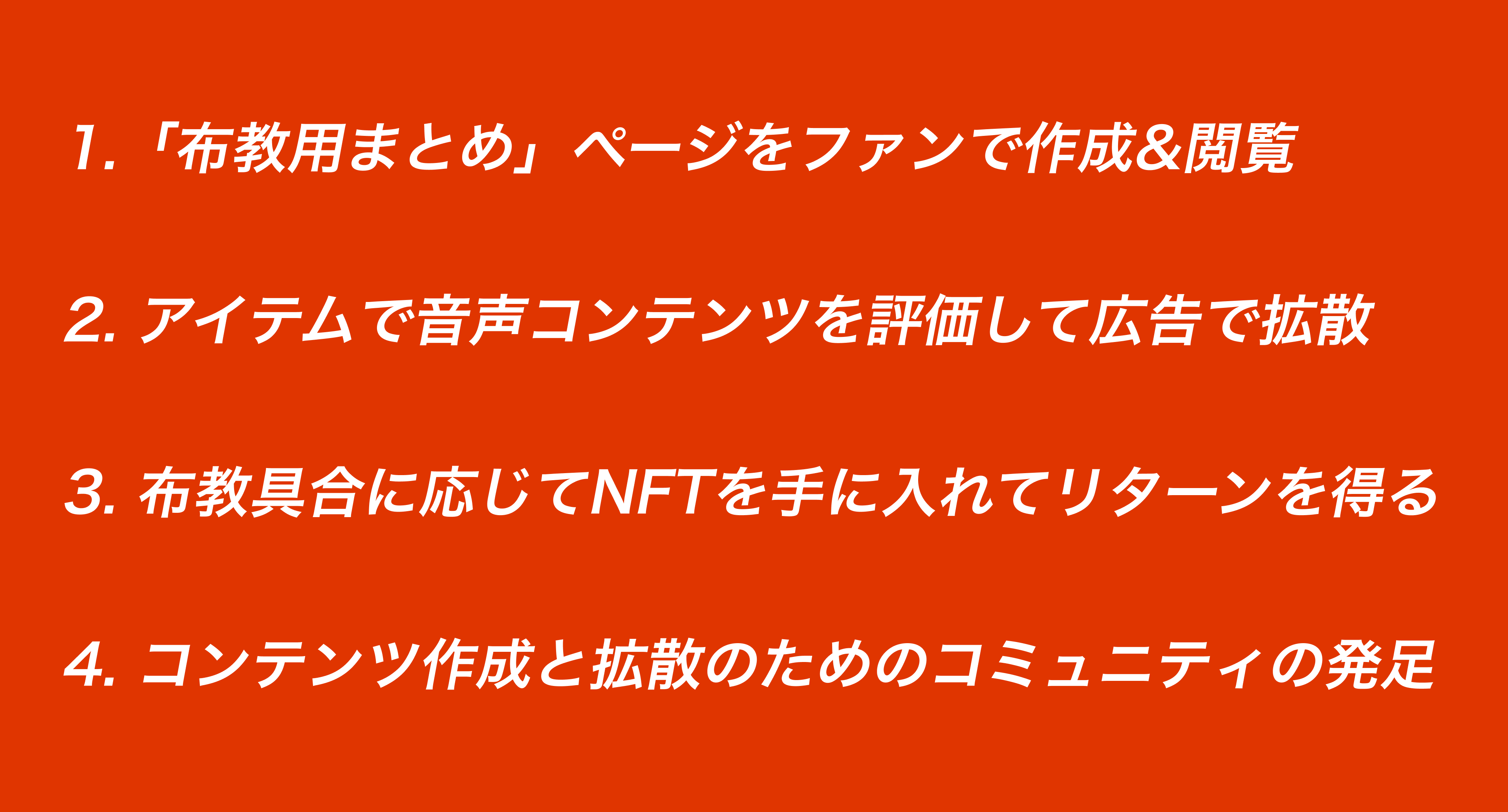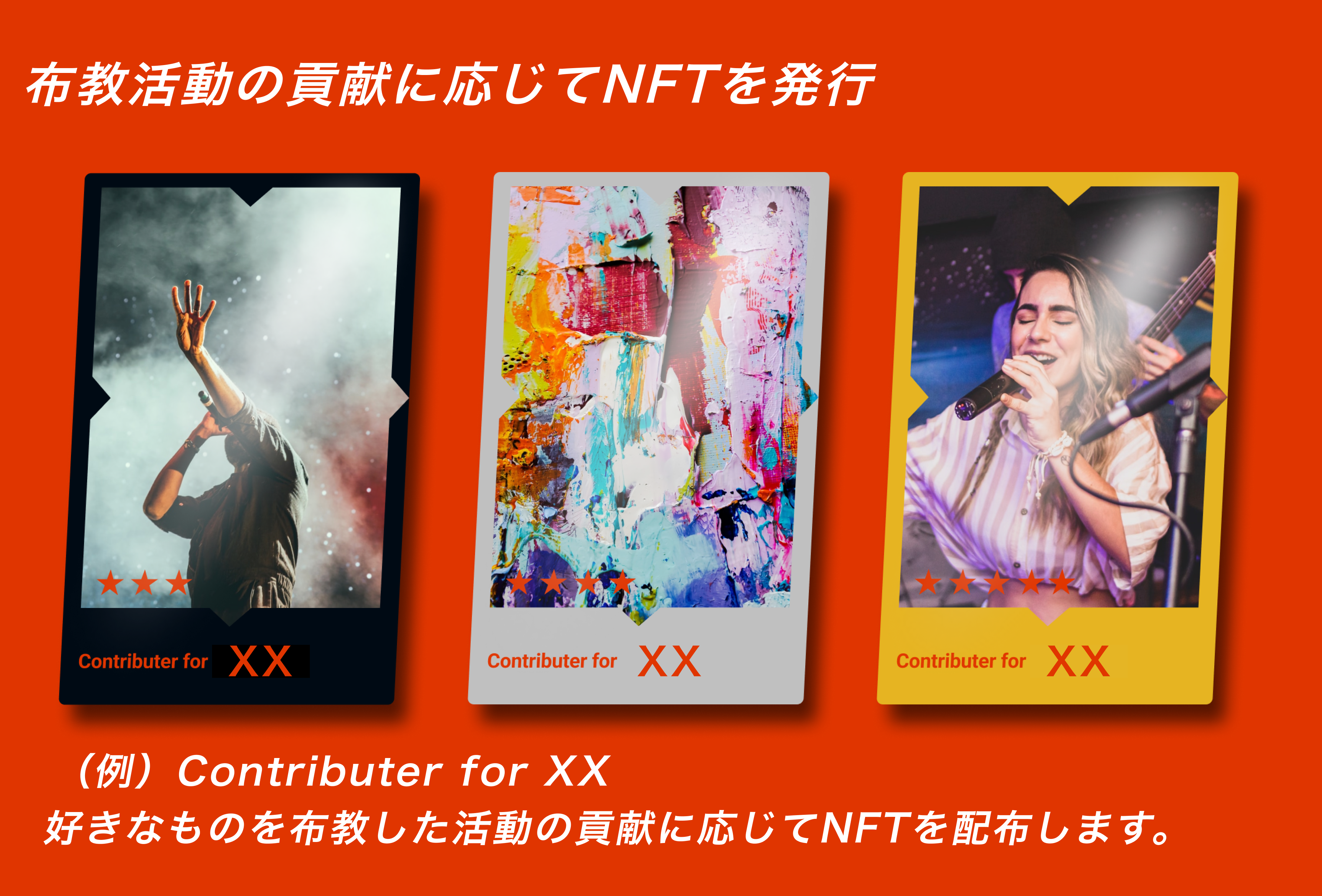 好きなものについてのコンテンツ作成・評価や布教活動に応じてNFTを発行します。NFTを所持している人は広告に出すコンテンツを決めることができたり、好きなものについてのメディアを共同制作できたり、金銭価値を受けとるができます。(※)