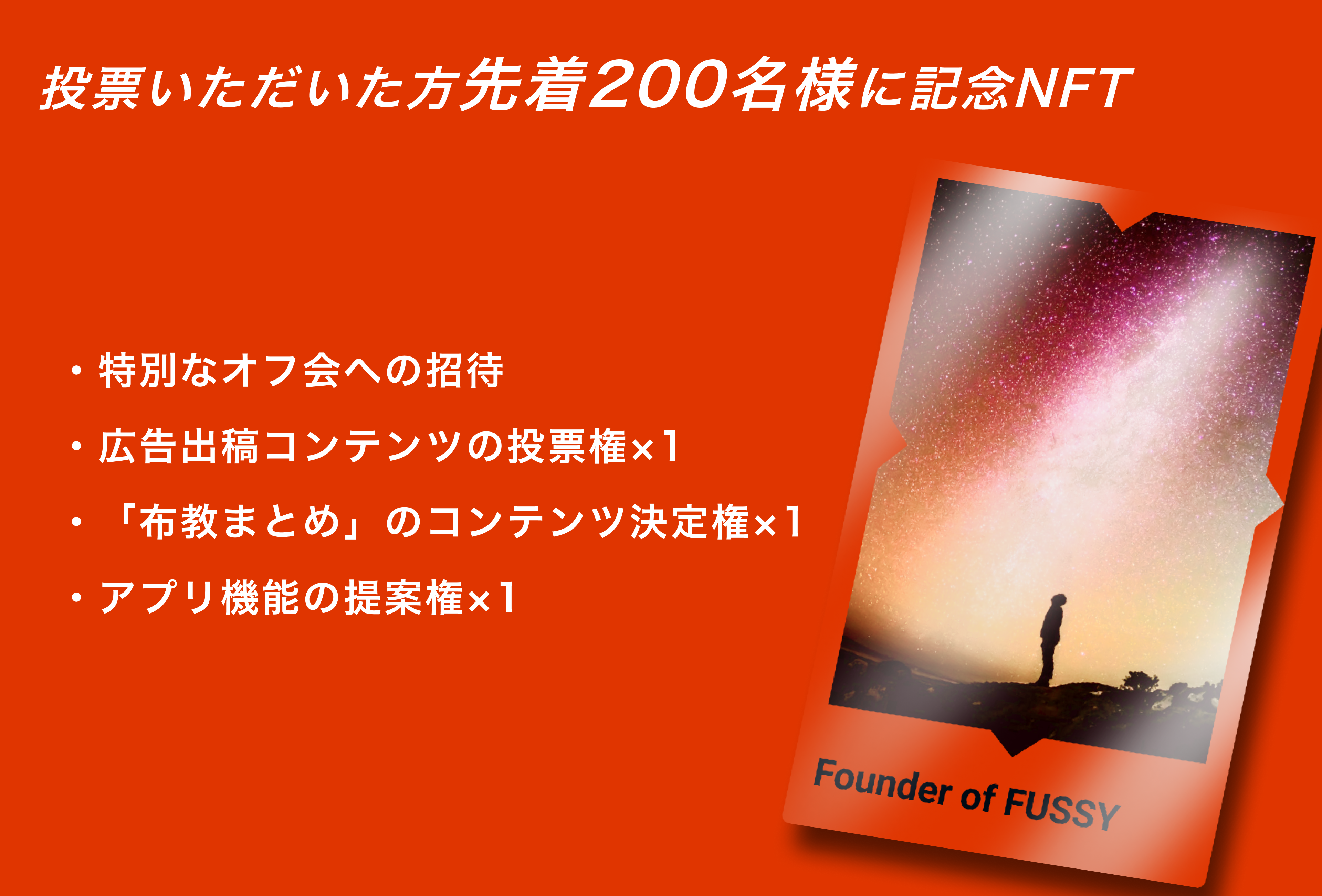 投票いただいた方先着200名様には後日、FUSSYの初期ファウンダーとしての記念NFTをお届けさせていただきます。
