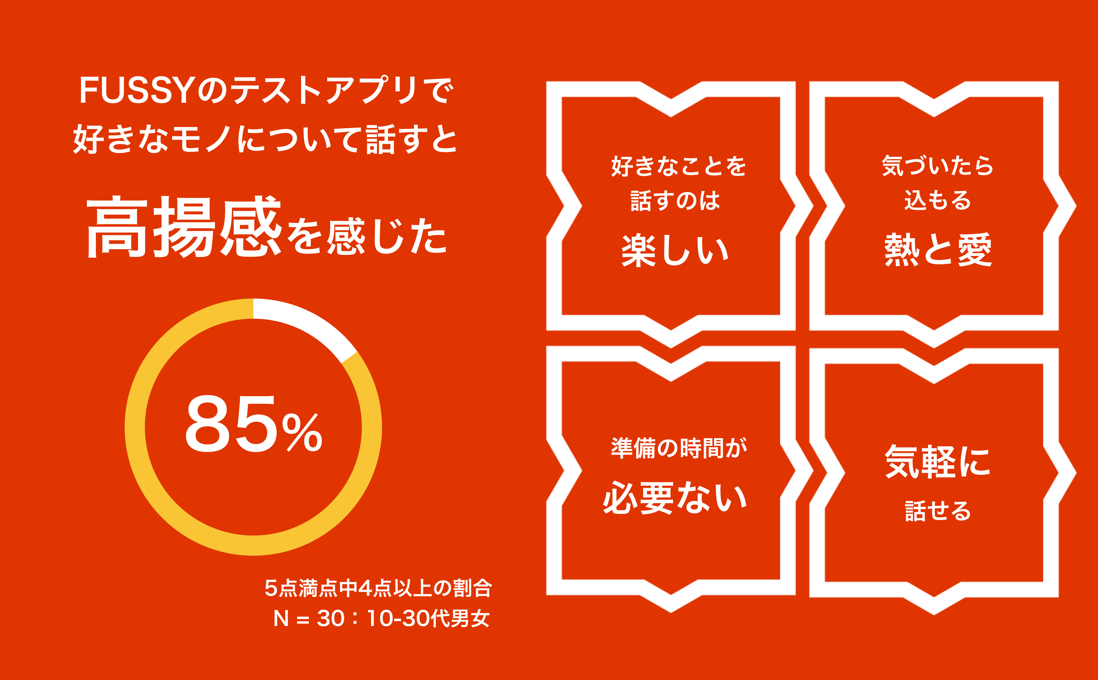 FUSSYは現在、テストアプリにて数十名の方々に5分程度の短尺音声をアップしていただいています。「トークテーマ」という機能を用意し、準備や企画を考える労力をできる限り少なくし、気軽に好きなことを話せるようにしました。現在利用いただいているユーザーの方の85%以上の方は話した後に「高揚感」を持っていただいています。