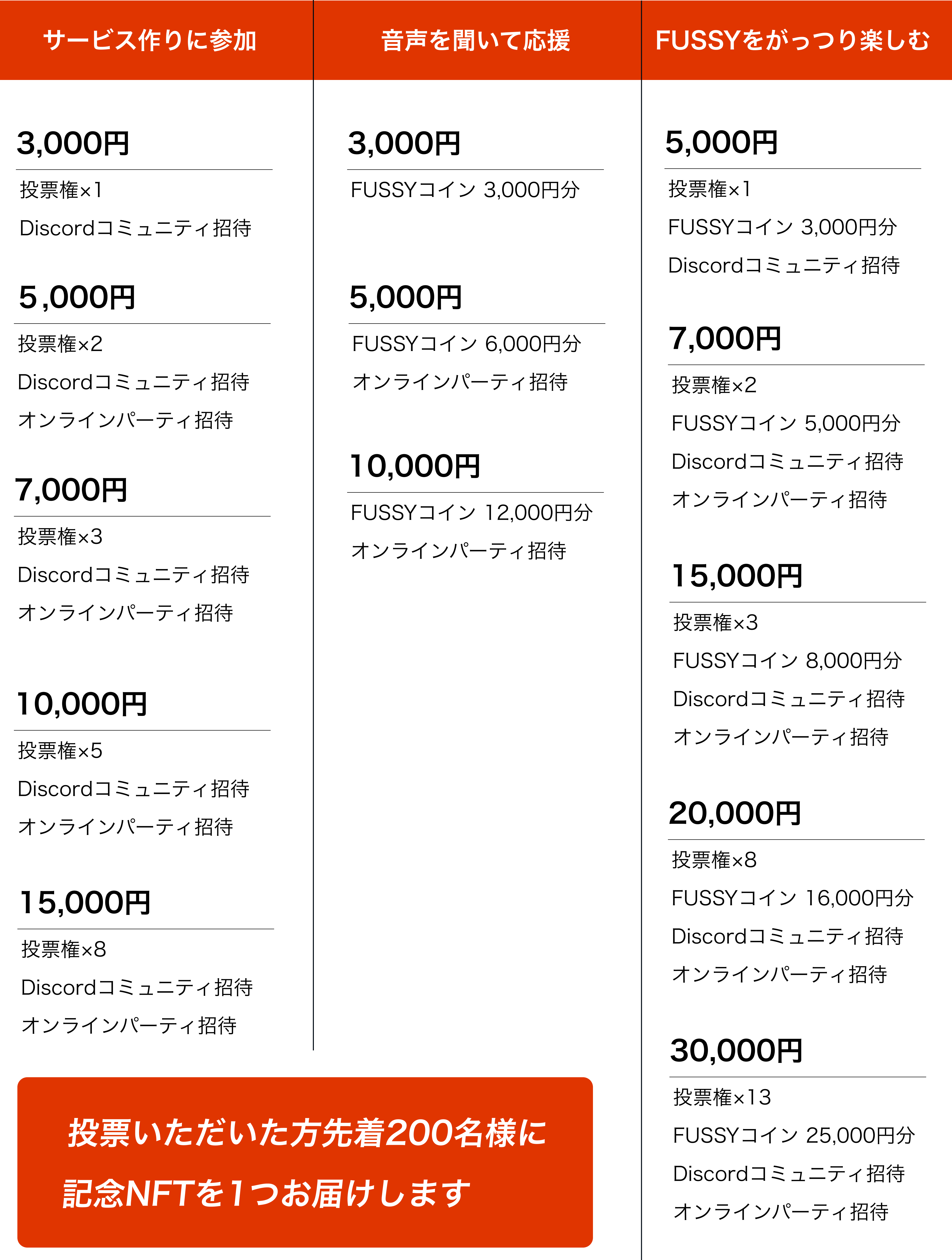 2022/07/08 14:42FUSSYのクラウドファンディングにご支援いただいた皆様こんにちは!株式会社FUSSYの矢田貝です。このメッセージは、先日行われたFUSSYのクラウドファンディングにご支援いただいた皆様にお送りしています。この度はFUSSYのクラウドファンディングにご支援いただきまして、誠にありがとうございました!お陰様で目標金額の150,000円を大きく超え、ご支援総額は308,000円となりました。達成できたのはひとえに皆様のご支援の何物でもございません。心より御礼申し上げます!FUSSYでは7月にモバイルアプリのリリース、次いで今秋以降に「NFTなどを通じて自分の好きなコンテンツを応援するFUSSY経済圏」のリリースに向けて準備を進めています。そこで現在の状況と、皆様からいただいたご支援に対するリターンについてご報告させていただきます。① FUSSYで取り扱うIPコンテンツの投票結果について8月を目処にiOS/Androidアプリの正式リリースを予定していますが、全てのIPコンテンツを最初から取り扱うことが難しいため、クラウドファンディングにご支援いただいた皆様からのご投票により、FUSSYが最初に取り扱うIPコンテンツが下記に決定いたしました。上記の投票結果に加えて、既に取り扱うことが決まっていた下記を含めた51のカテゴリを取り扱うことになりました。皆さんの好きなコンテンツは含まれていましたでしょうか?ぜひFUSSYを通じて、各コンテンツを応援いただけると嬉しいです!② 8月にリリースを予定している音声モバイルアプリ"FUSSY"について上述の投票結果を基に、代表の加留部と副業で手伝ってくれているエンジニアさんの2名体制でモバイルアプリを鋭意開発中です。③ 支援に対するリターンについて・支援内容:サービス内コインについて / オンラインリリースパーティーの招待について→8月のリリース前に詳細のご案内をお送りさせていただきますので、もう少しお待ちくださいませ。・支援内容:NFTについて / Discordコミュニティへの招待について→NFTについては今秋以降のリリースを予定しています。単なるNFTをご提供することに留まらず、より中長期的にNFTに価値が出るようなもの、FUSSYを長く応援していただけるための仕組み、その他ユーティリティに溢れたようなものを構想しておりますが、また詳細が決まり次第ご連絡をさせてください。デザイン案は固まってきていますので、そちらだけ少しお見せします!以上となります。また定期的に、お伝えできる内容が出来たらレポートさせてください!引き続きご支援のほど、よろしくお願いします。株式会社FUSSY加留部有哉矢田貝栄治 もっと見る