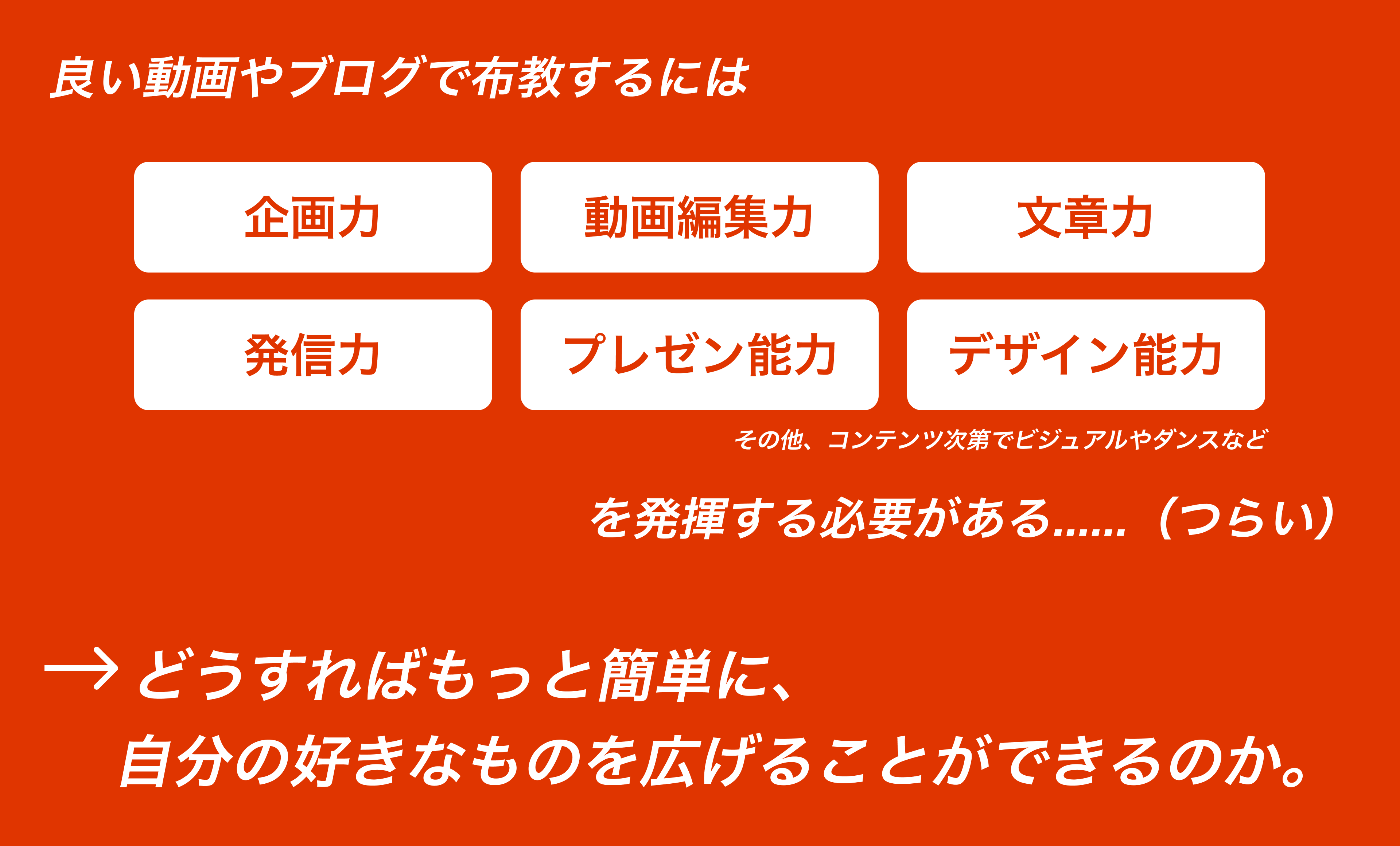 もっともっと好きなものへの愛を語って魅力を知って欲しいのですが、この熱量をぶつける場所がありませんでした。特別な能力必要なく、140文字では抑えきれない熱を吹き込んで好きなものを応援できる場所が必要だと思ったのです。