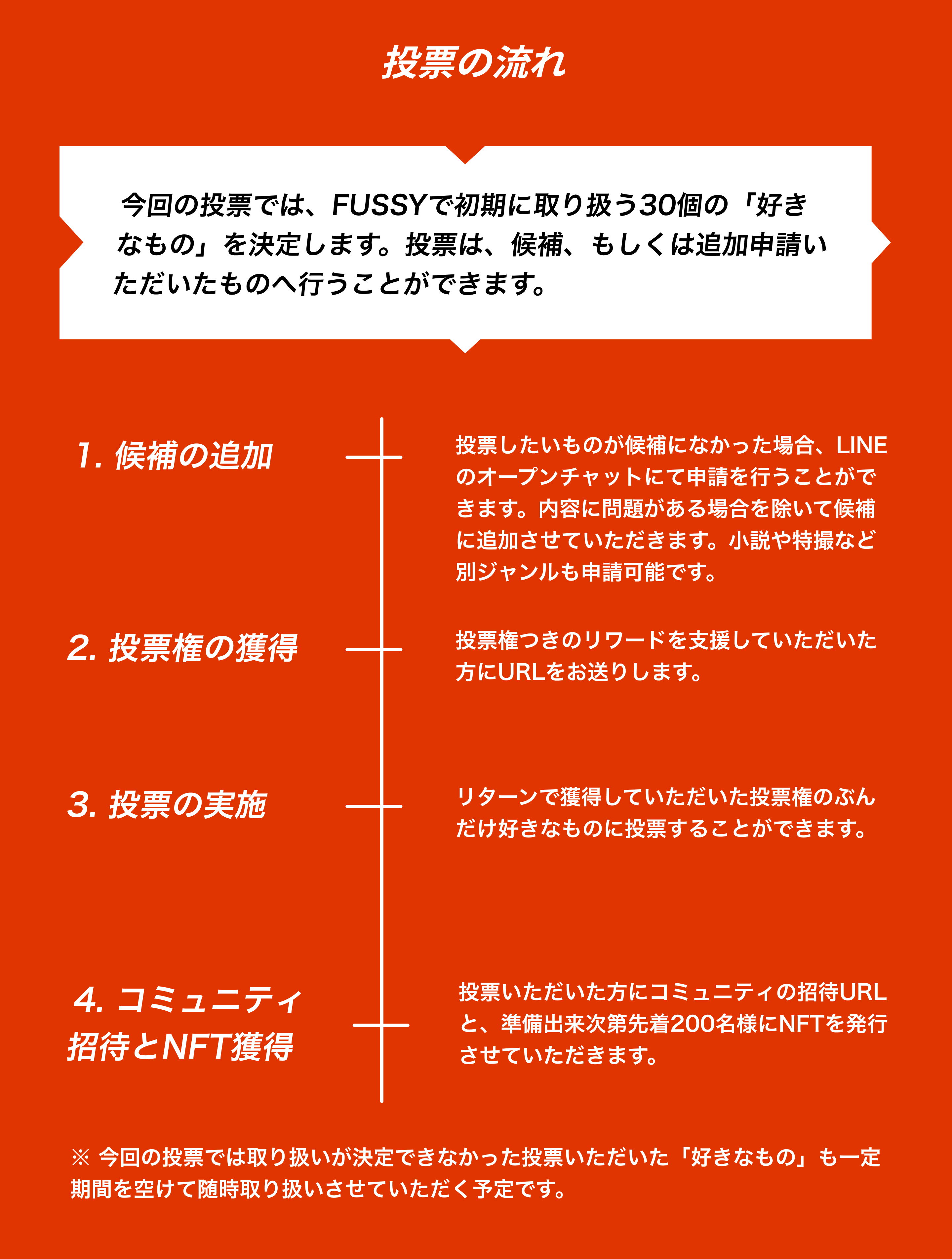 今回のプロジェクトでは、FUSSYの目的に共感いただいた方に「FUSSYはどんな『好きなもの』を取り扱うべきか」の意思決定に「投票」という形で参加して一緒にサービスを作っていきたいと思っています。