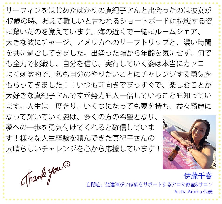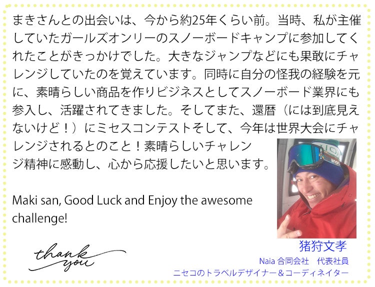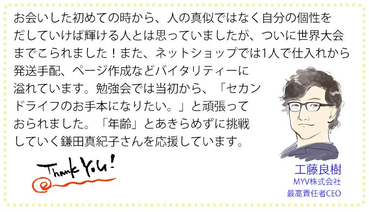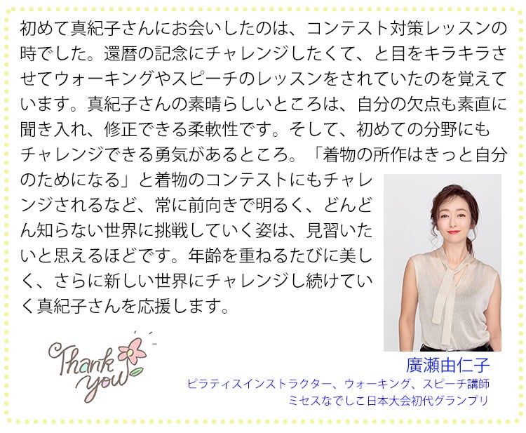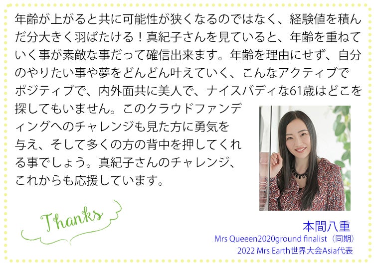 今日がこれからの人生で一番若い日です。私を世界大会、ミセスクラシックグローブに選んでいただいたことに感謝し、出来る限りの努力をして、世界の舞台に立ちます。そして、いくつになっても、自分がやりたいことにブレーキをかけないでいいということや、どんな苦難があっても夢や目標があれば、年齢に関係なく、病気をも克服し、道は開けるということをを多くの方と共感していきたいと思っています。