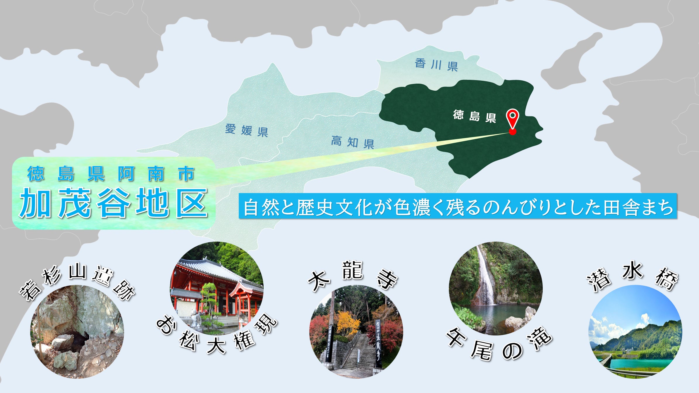 私が生まれ育った阿南市加茂谷地区は、徳島県南東部を流れる那賀川の中流域に点在する10町からなる自然豊かな田舎町。歴史観光資源に恵まれていて、特に昔からお遍路さんの要所として農業や飲食・宿泊業を中心に細々と発展して参りました。日本一古い辰砂を採掘した若杉山遺跡や弘法大師修行の地 四国霊場21番札所 太龍寺、日本三大怪猫伝のひとつとして知られるお松大権現など古くから歴史を大切にしながら近年は移住促進にも力を入れており加茂谷という地域と人々の魅力に取りつかれた多くの移住者がます。