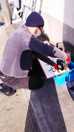 髪のカットも。 紙(シート)のカットもする美容師。 建物裏側の看板を作ってくれました。