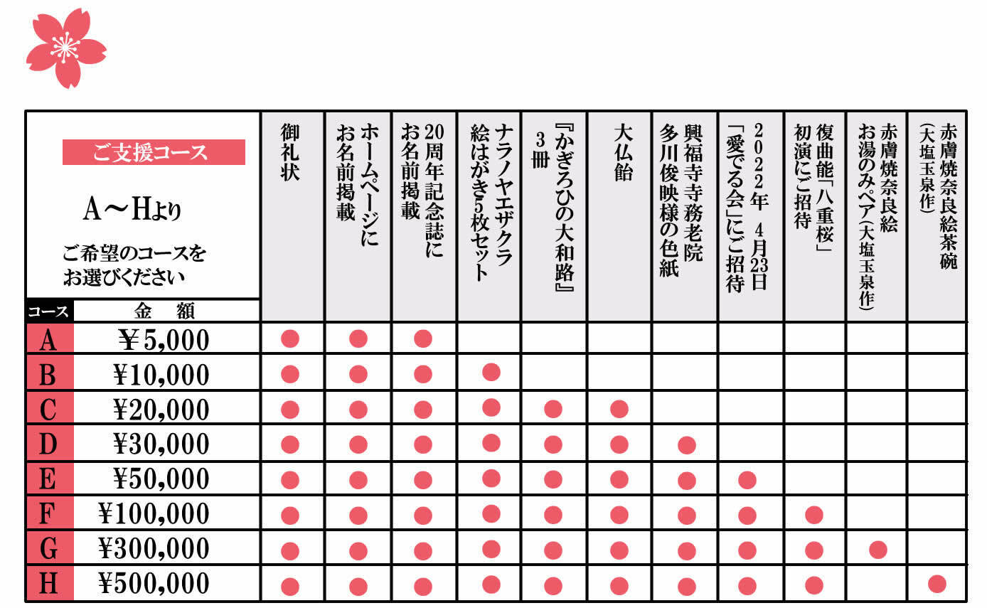 興福寺は奈良八重桜の最もご縁の深いゆかりの地であり、前貫首多川俊映様(現寺務老院)には名誉会員になって頂いている。毎年全会員に特別拝観証の発行して頂く。